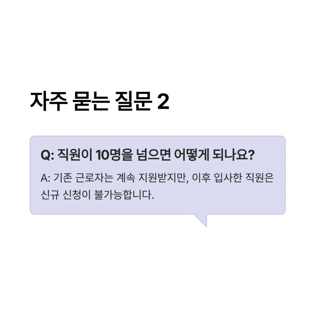 A: 직원이 10명을 넘더라도 지원받고 있던 기존 근로자에 대해서는 계속 지원이 유지됩니다. 다만 그 이후 입사한 직원에 대해서는 신규 신청이 불가능합니다.