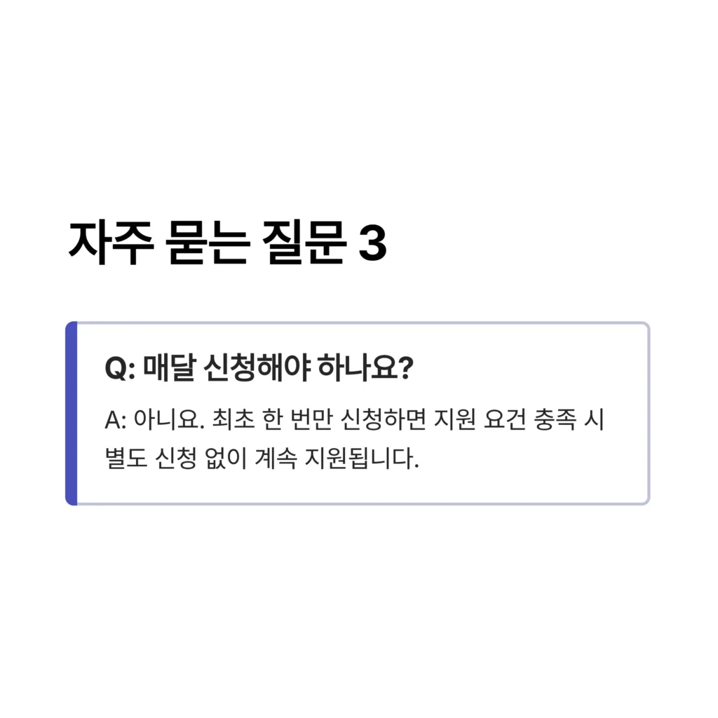 A: 아니요 최초 한 번만 신청하면 지원 요건이 충족되는 동안에는 별도의 신청 없이 계속 지원됩니다.