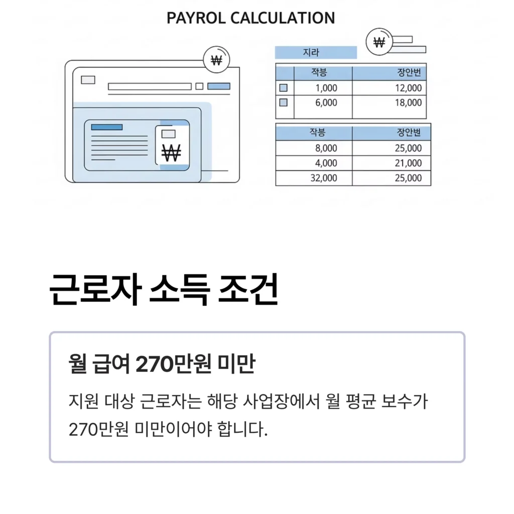 지원 대상이 되는 근로자는 해당 사업장에 근무하며 월 평균 보수가 270만원 미만이어야 합니다. 단, 가입일 직전 6개월간 고용보험과 국민연금 자격취득 이력이 없는 신규 가입자여야 지원받을 수 있습니다.