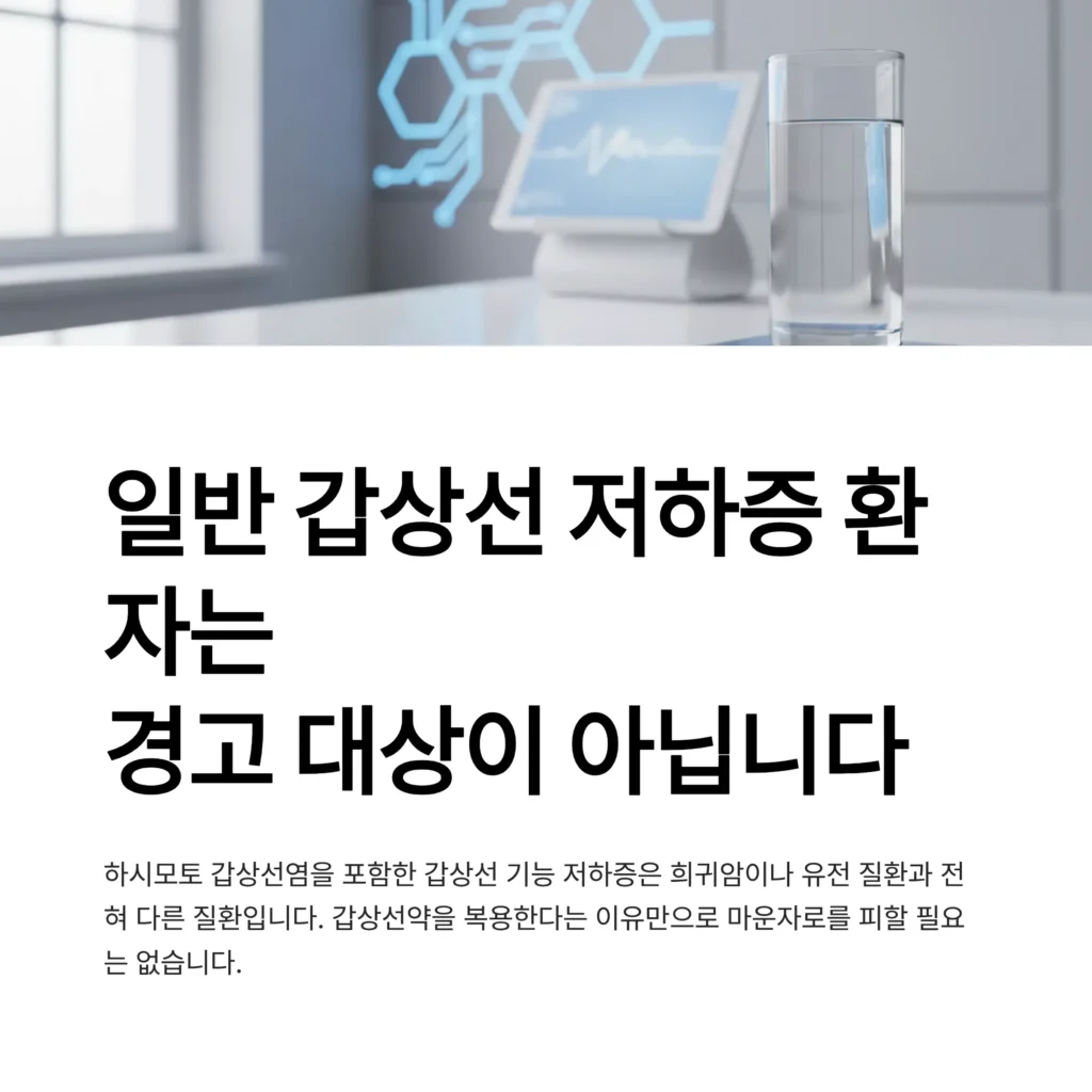많은 분들이 앓고 계시거나 걱정하는 갑상선 기능 저하증(하시모토 갑상선염 포함)은 위에서 언급한 희귀암이나 유전 질환과는 전혀 다른 질환입니다. 따라서 갑상선 기능 저하증이 있다는 이유만으로 마운자로의 갑상선암 경고 대상이 되지는 않습니다.