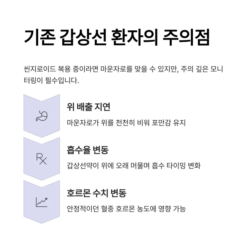 고로 마운자로가 위의 배출을 늦추면 씬지로이드가 위에서 머무는 시간이 길어지고 장으로 내려가는 타이밍이 달라질 수 있습니다. 이는 결국 갑상선약의 흡수율이나 속도에 변동성을 유발하여 기존에 안정적으로 유지되던 혈중 갑상선 호르몬 수치를 흔들 수 있는 잠재적 위험이 됩니다.