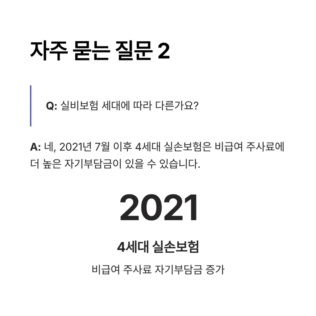 A: 네 다를 수 있습니다. 특히 2021년 7월 이후 가입한 4세대 실손보험은 비급여 주사료에 대해 일부 자기부담금이 더 높거나 특약에 가입해야만 보장되는 경우가 있으니 본인의 약관을 확인해보는 것이 좋습니다.
