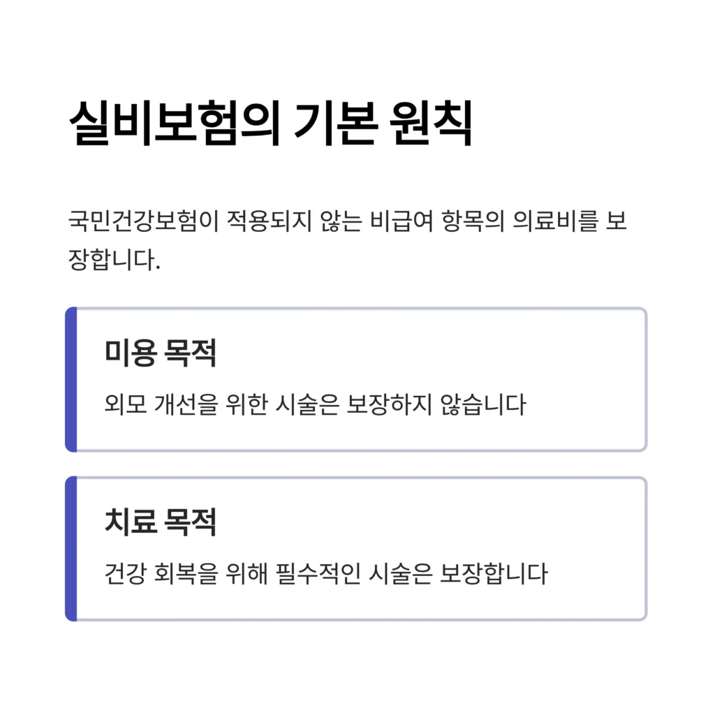 이것이 가장 중요한 원칙입니다. 실비 보험 약관은 한결같이 외모 개선을 위한 미용 목적의 시술은 보장하지 않습니다. 반면 의사가 건강 회복을 위해 필수적이라고 판단하는 질병 치료 목적의 시술은 보장합니다.