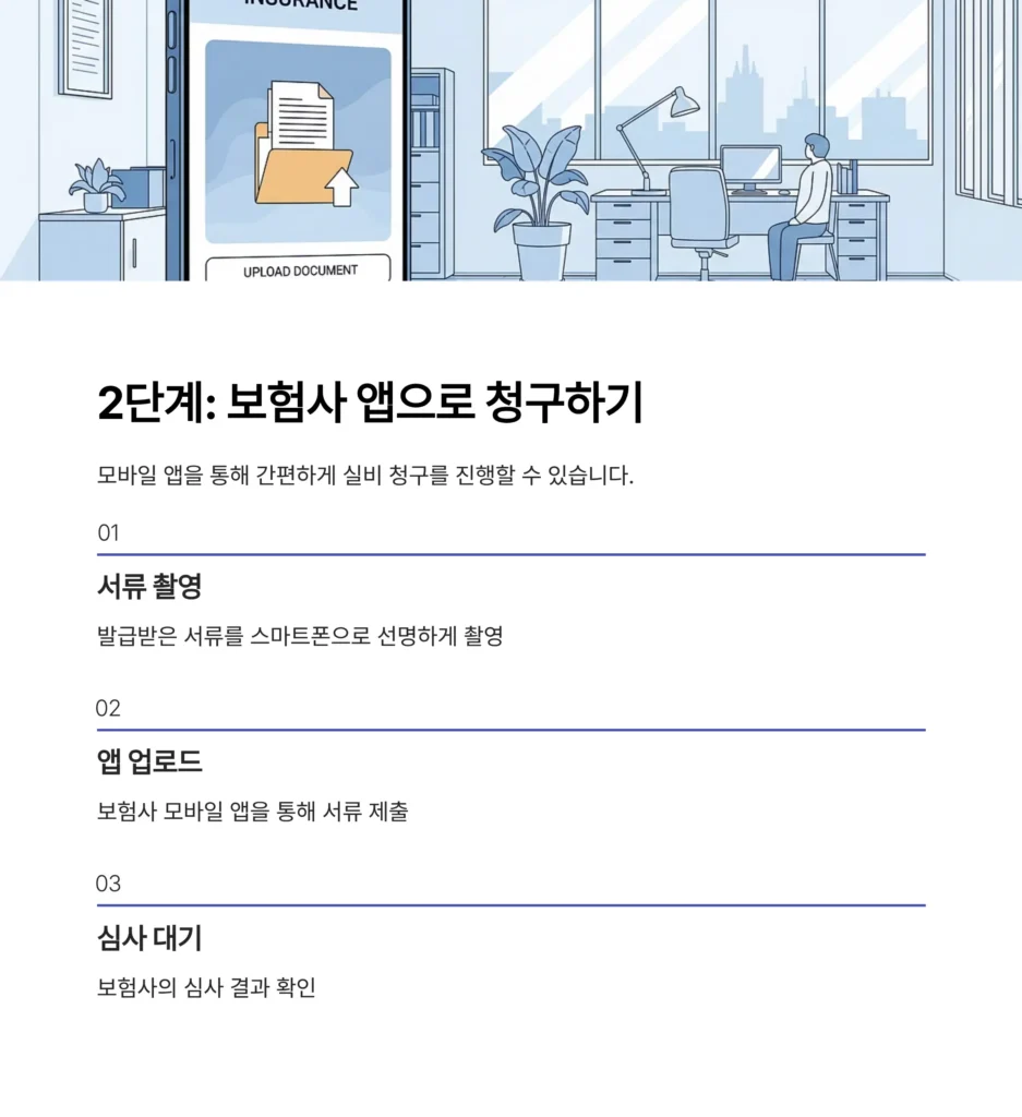 요즘은 대부분의 보험사가 모바일 앱을 통해 간편하게 실비 청구를 받고 있습니다. 발급받은 서류들을 스마트폰으로 선명하게 촬영하여 앱을 통해 제출하면 됩니다.