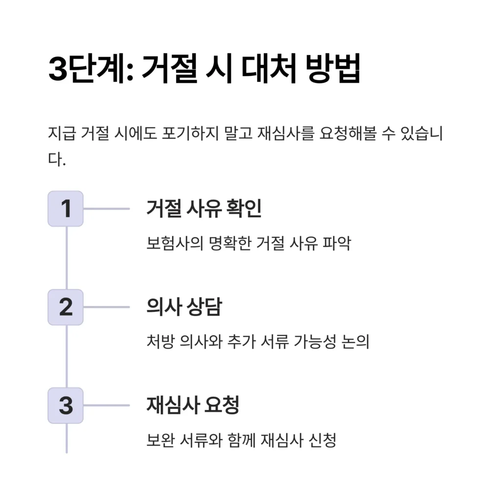 만약 보험사가 지급을 거절한다면 거절 사유를 명확하게 확인해야 합니다. 만약 치료 목적에 대한 소명이 부족하다면 처방받은 의사와 상담하여 보완할 수 있는 서류(상세 소견서 등)가 있는지 확인하고 재심사를 요청해볼 수 있습니다.