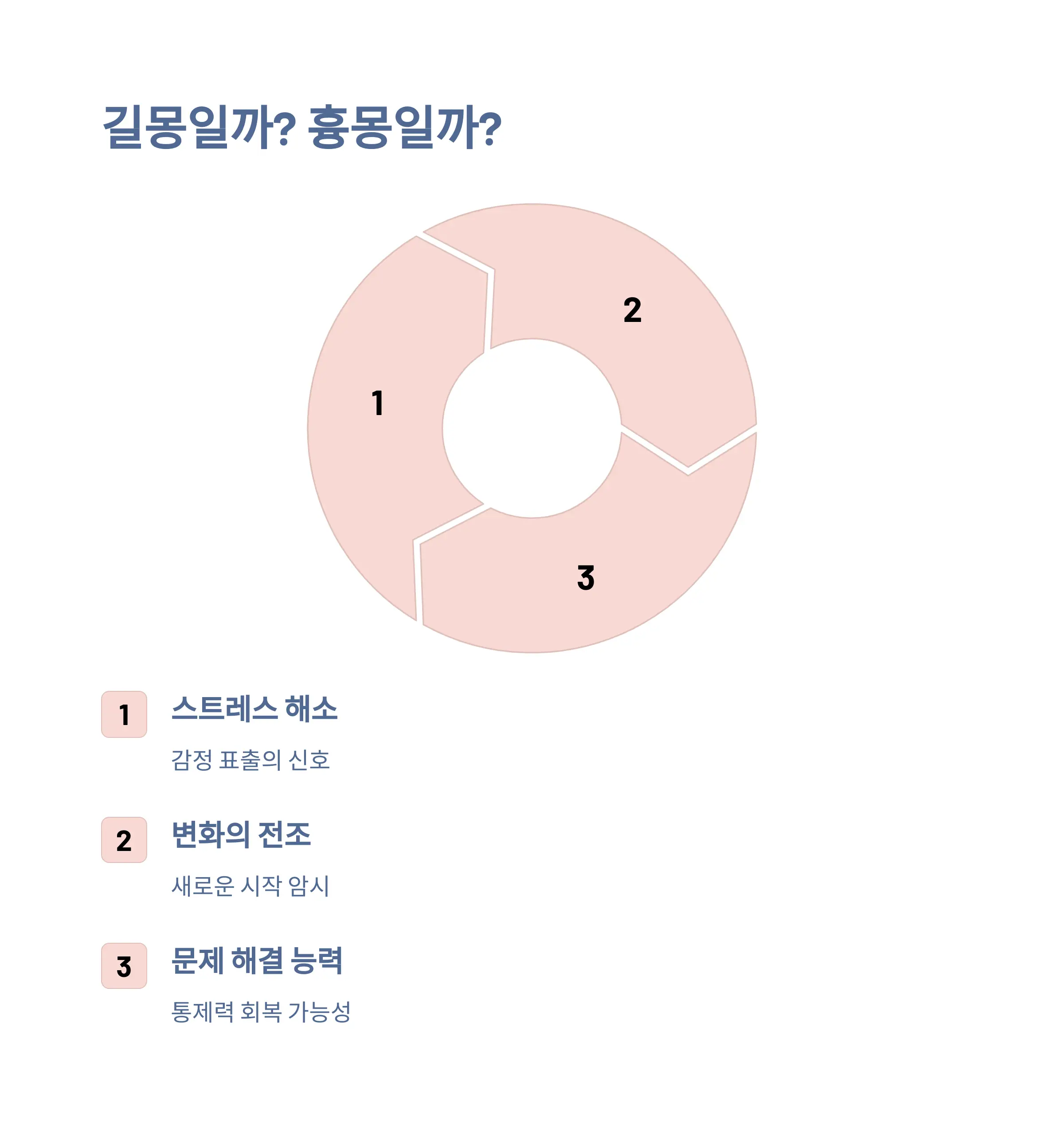 이런 꿈은 종종 스트레스를 인지하고 감정을 조절하라는 내면의 신호이기도 합니다. 자주 반복된다면 내면의 불안 신호일 수 있으니, 일기나 상담 등을 통해 감정을 풀어내는 것이 도움이 됩니다.