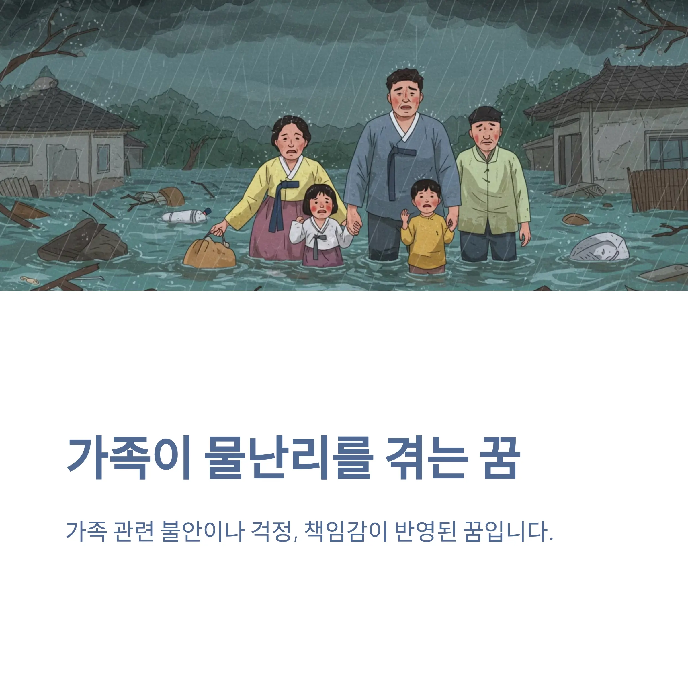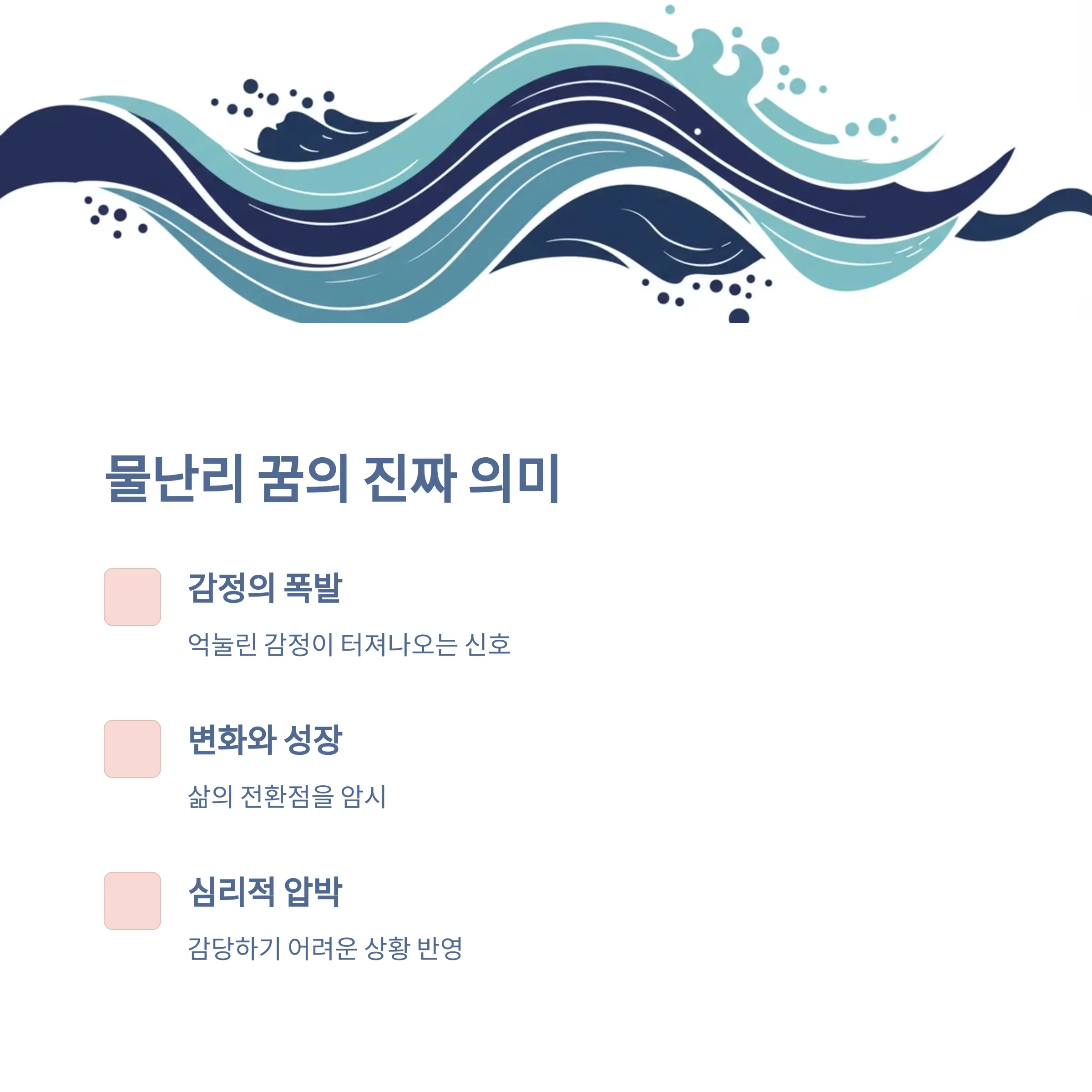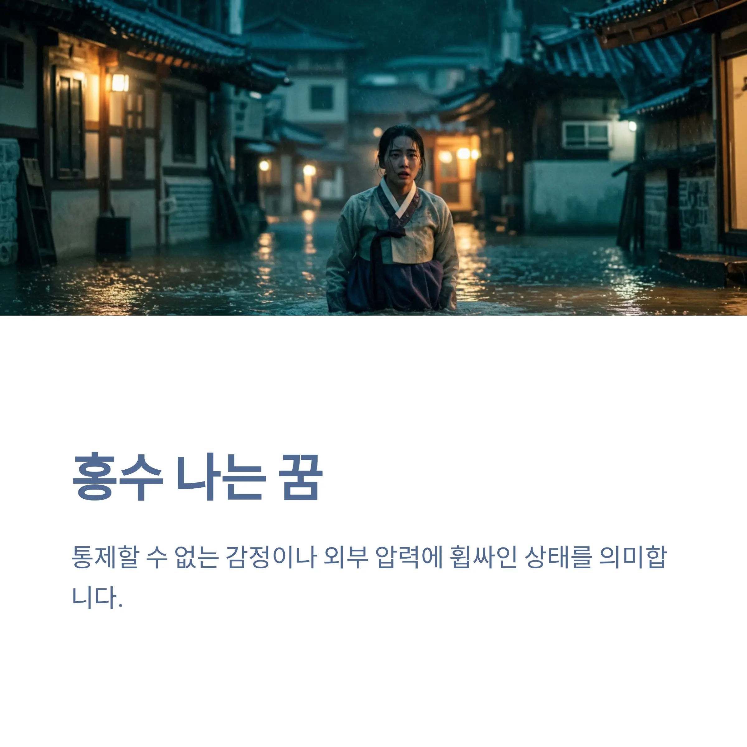 물난리 나는 꿈은 단순히 ‘불길한 예감’이 아닙니다. 오히려 내 감정이 얼마나 억눌려 있었는지, 어떤 변화가 다가오고 있는지를 보여주는 중요한 신호일 수 있습니다.