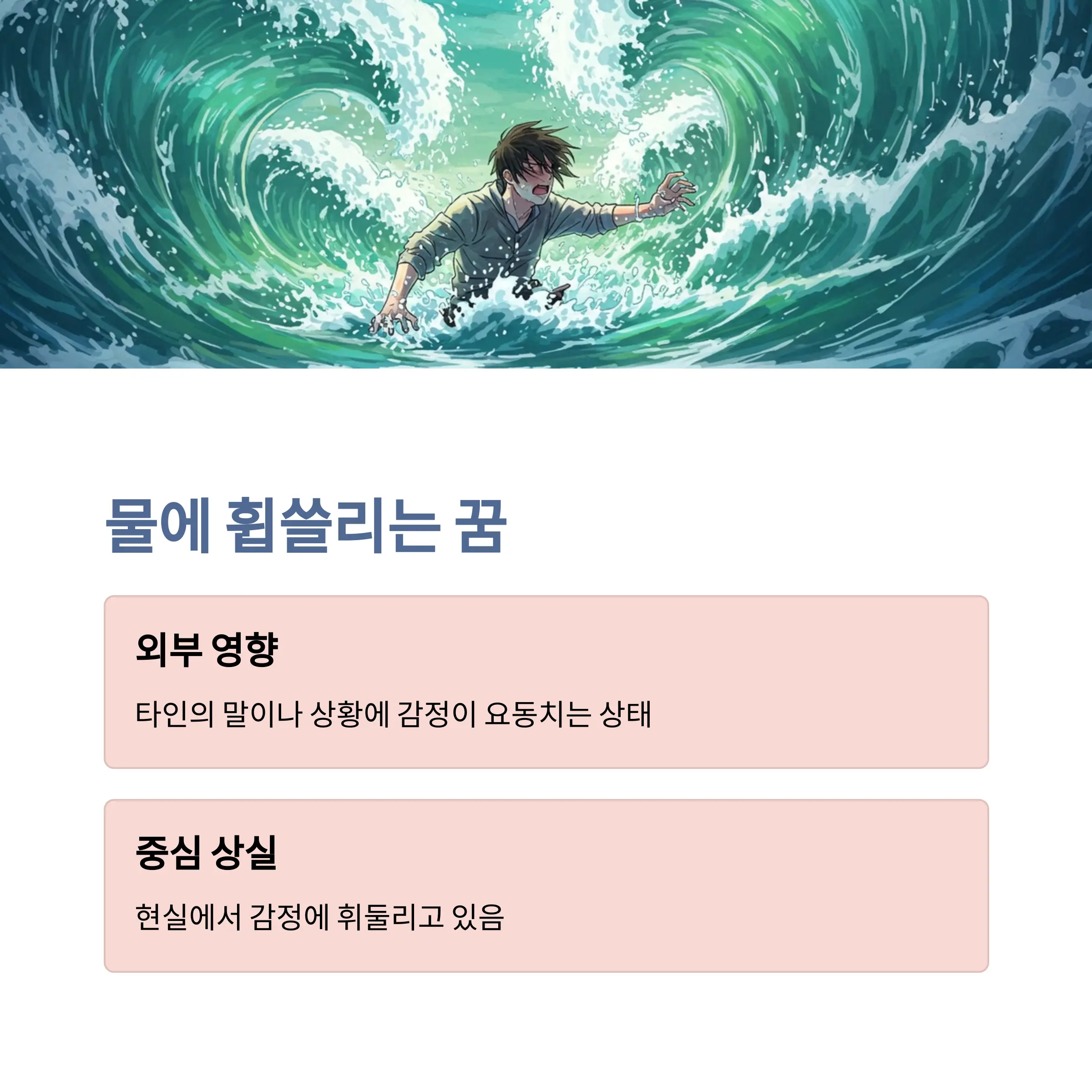 내가 아닌 외부 상황에 의해 감정이 요동치는 상태입니다. 현실에서 중심을 잃고 감정에 휘둘리고 있을 가능성이 큽니다. 누군가의 말, 상처, 비난에 마음이 흔들리는 상황을 상징할 수 있습니다.