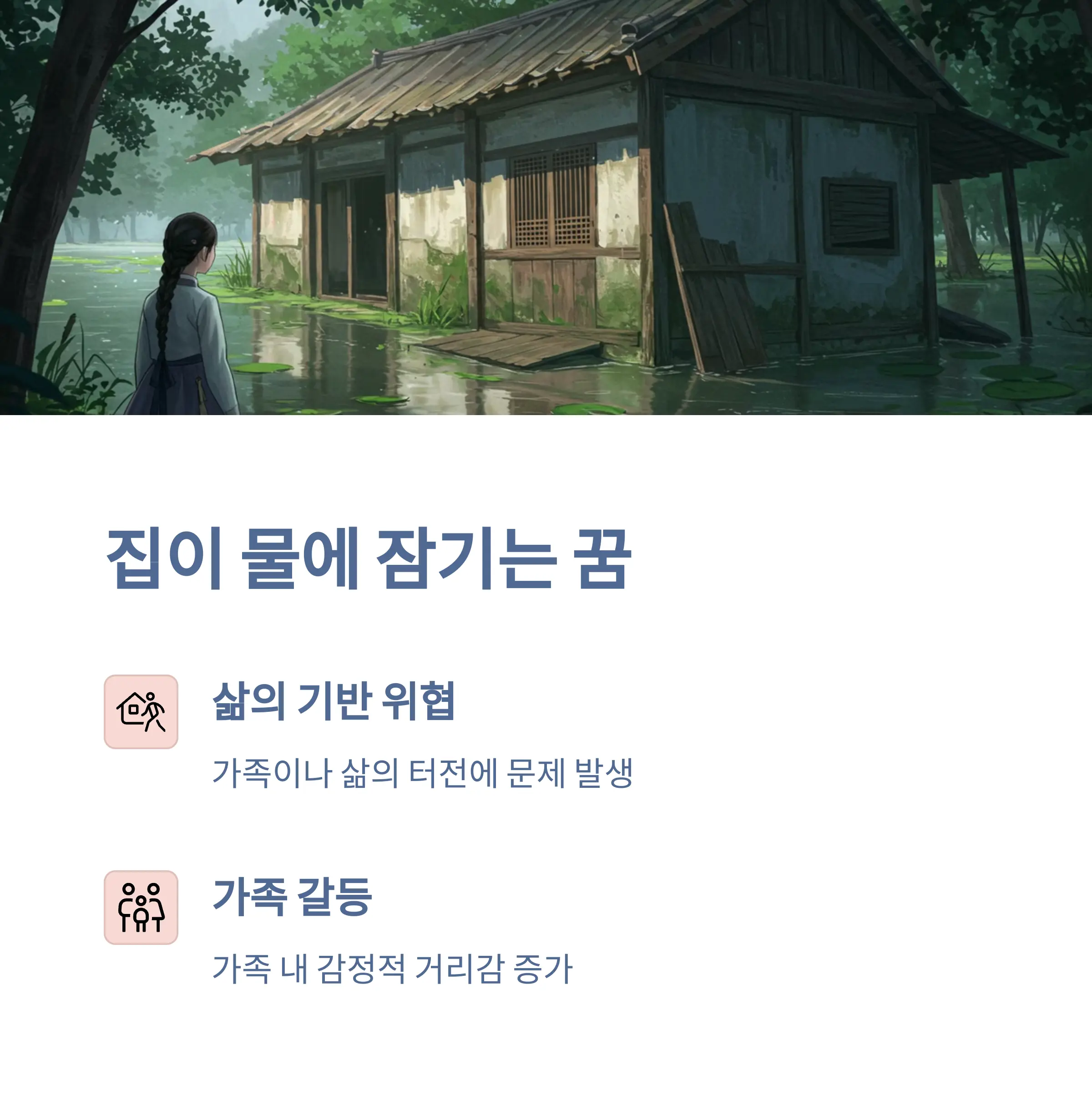 ‘집’은 나 자신 또는 가족, 삶의 터전을 의미합니다. 이 꿈은 내 삶의 기반이 위협받고 있거나, 가족 내에서 감정적 거리가 벌어졌다는 신호일 수 있습니다. 금전적인 문제, 이사 계획, 가족 간 갈등 등 현실 속 이슈와 연결해 보면 더 정확한 해석이 가능합니다.