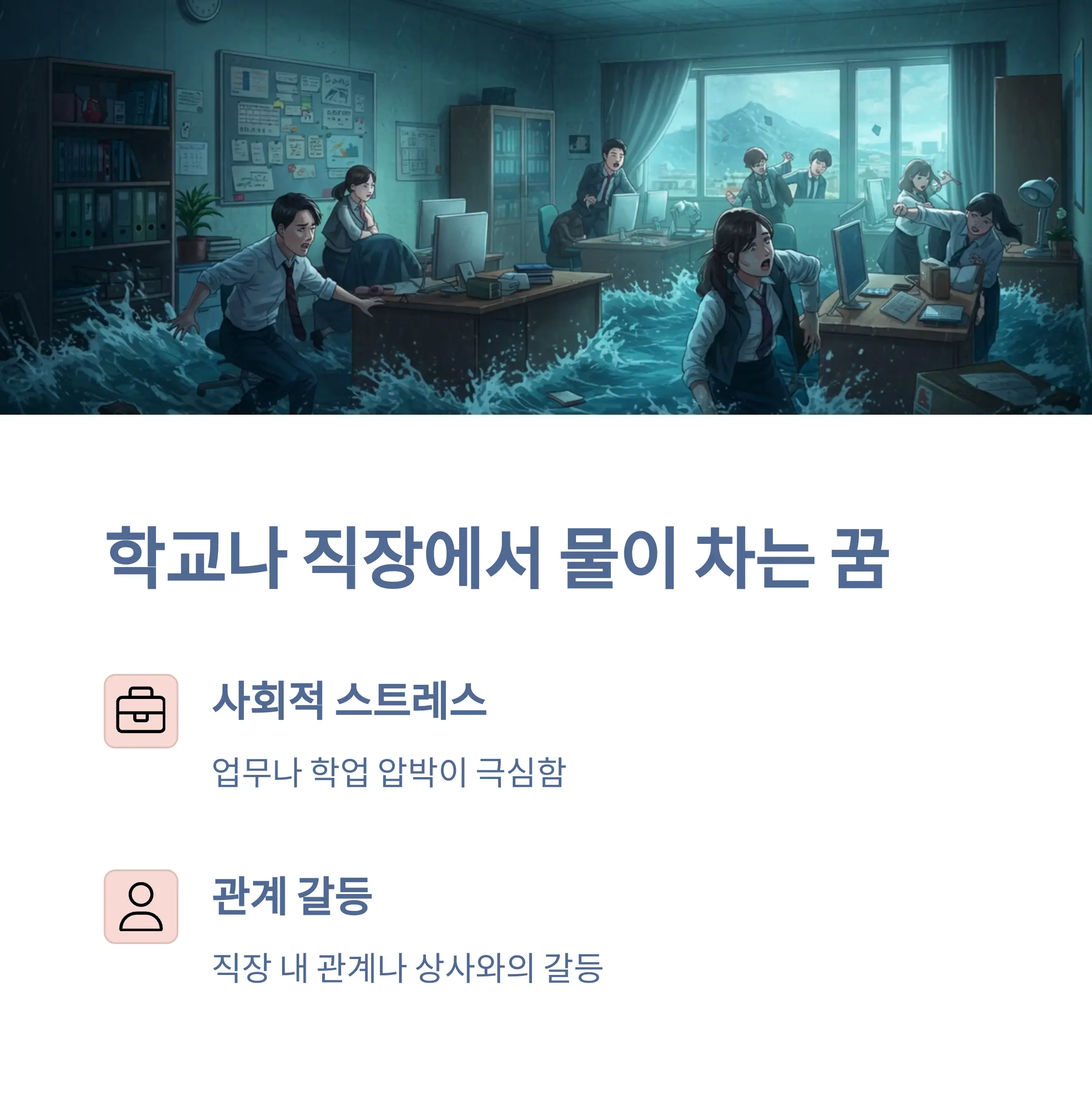 사회적 관계, 경쟁, 압박 등에서 오는 스트레스가 극심할 때 나타납니다. 공부나 업무가 과도해 감정이 터질 지경일 때 물로 표현되는 경우가 많습니다. 특히 직장 내 관계, 상사와의 갈등, 학업 성취에 대한 부담이 클 때 자주 꾸는 꿈입니다.