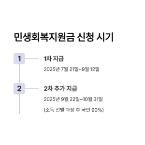 • 2차 추가 지급(국민 90%): 2025년 9월 22일부터 10월 31일까지 신청 가능 (소득 선별 과정을 거쳐 지급)
