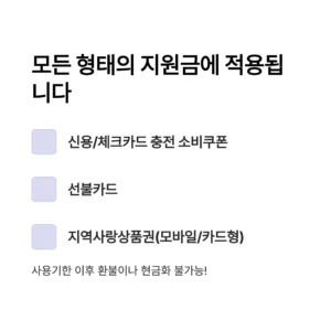 • 적용 대상: 신용/체크카드에 충전된 소비쿠폰, 선불카드, 지역사랑상품권(모바일형/카드형) 모두 동일하게 적용됩니다.