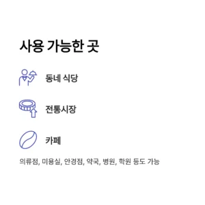 동네 마트, 식당, 카페, 전통시장, 의류점, 미용실, 안경점, 약국, 병원, 학원 등 대부분의 동네 상점에서 사용 가능합니다.