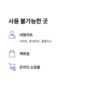 대형마트(이마트, 롯데마트, 홈플러스 등), 백화점, 면세점, 기업형 슈퍼마켓(SSM), 온라인 전자상거래(쇼핑몰, 배달 앱 등), 대형 전자제품 판매점 등에서는 사용이 불가합니다.