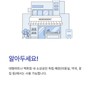 • 예외: 대형마트나 백화점 내에 입점한 임대 매장 중 소상공인이 독립적으로 운영하는 점포(미용실, 약국, 꽃집 등) 에서는 사용이 가능합니다.