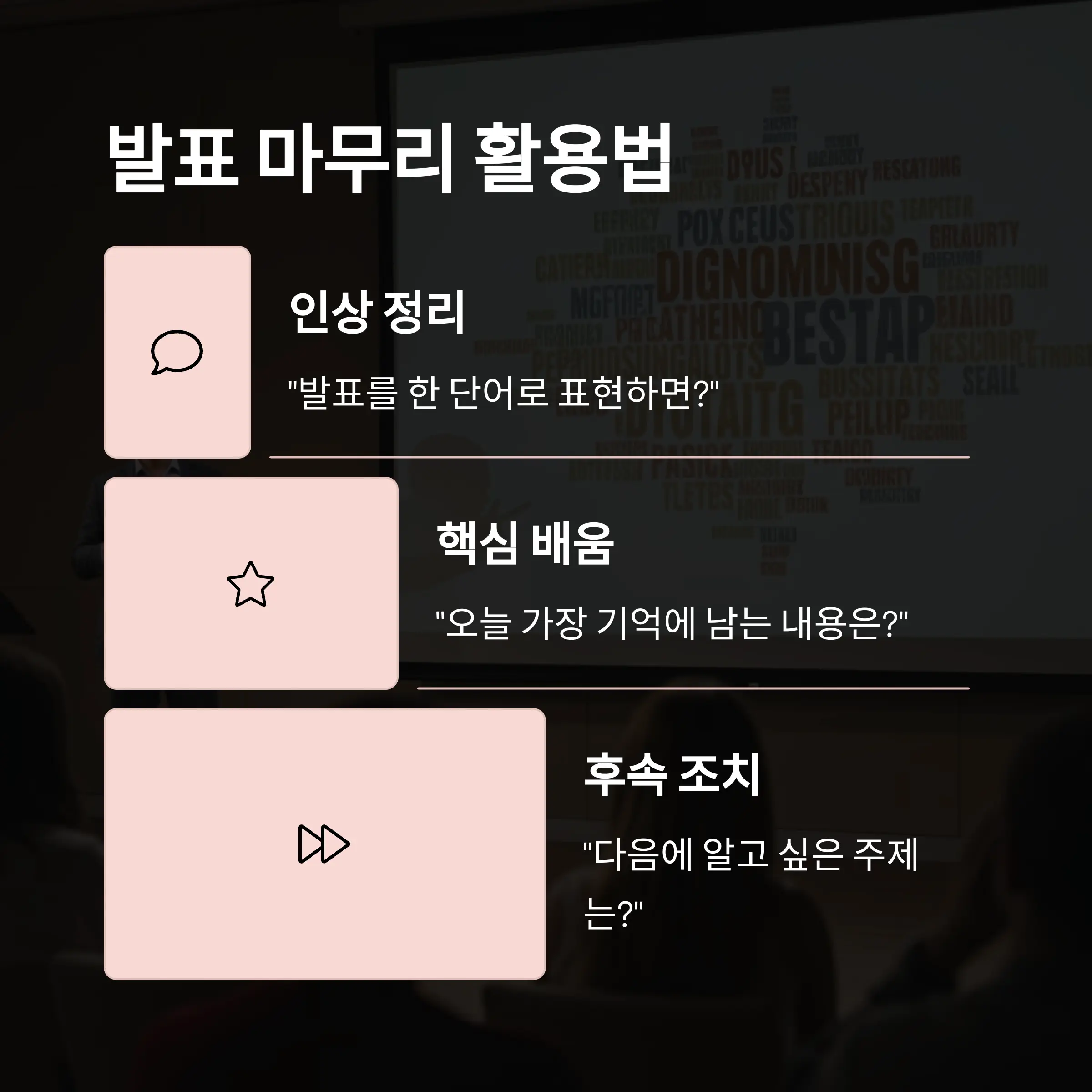 질문 예시: “오늘 발표를 한 단어로 표현하면?”