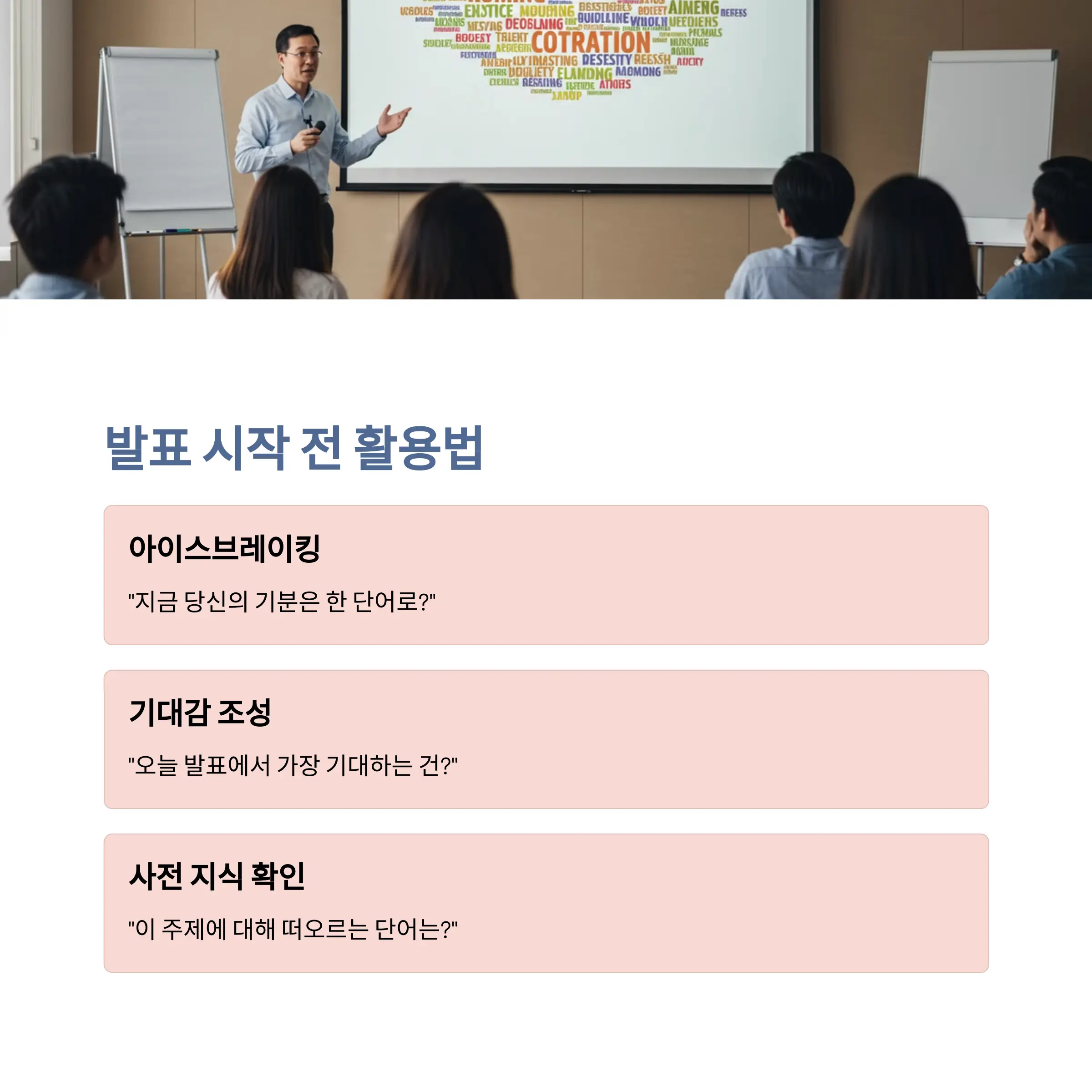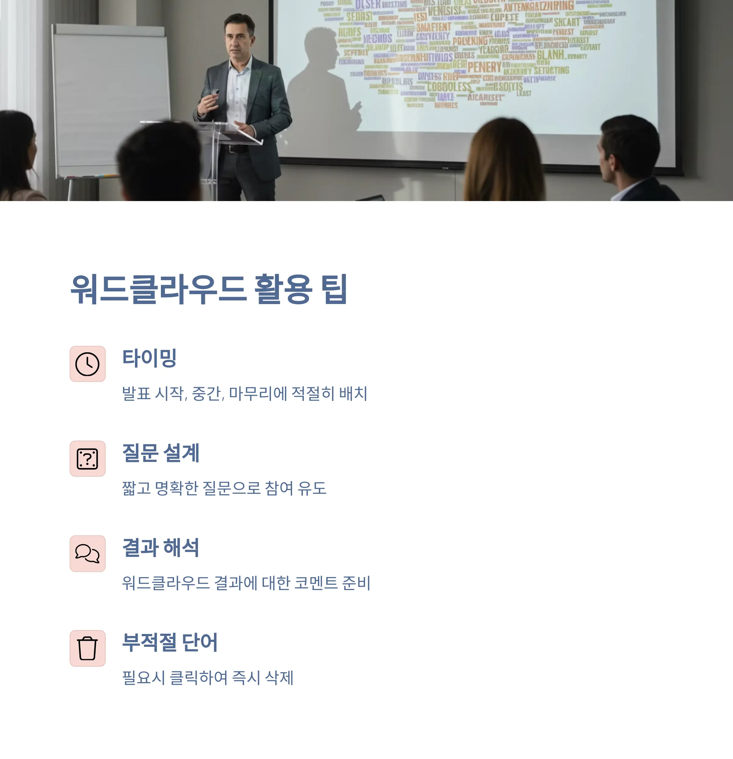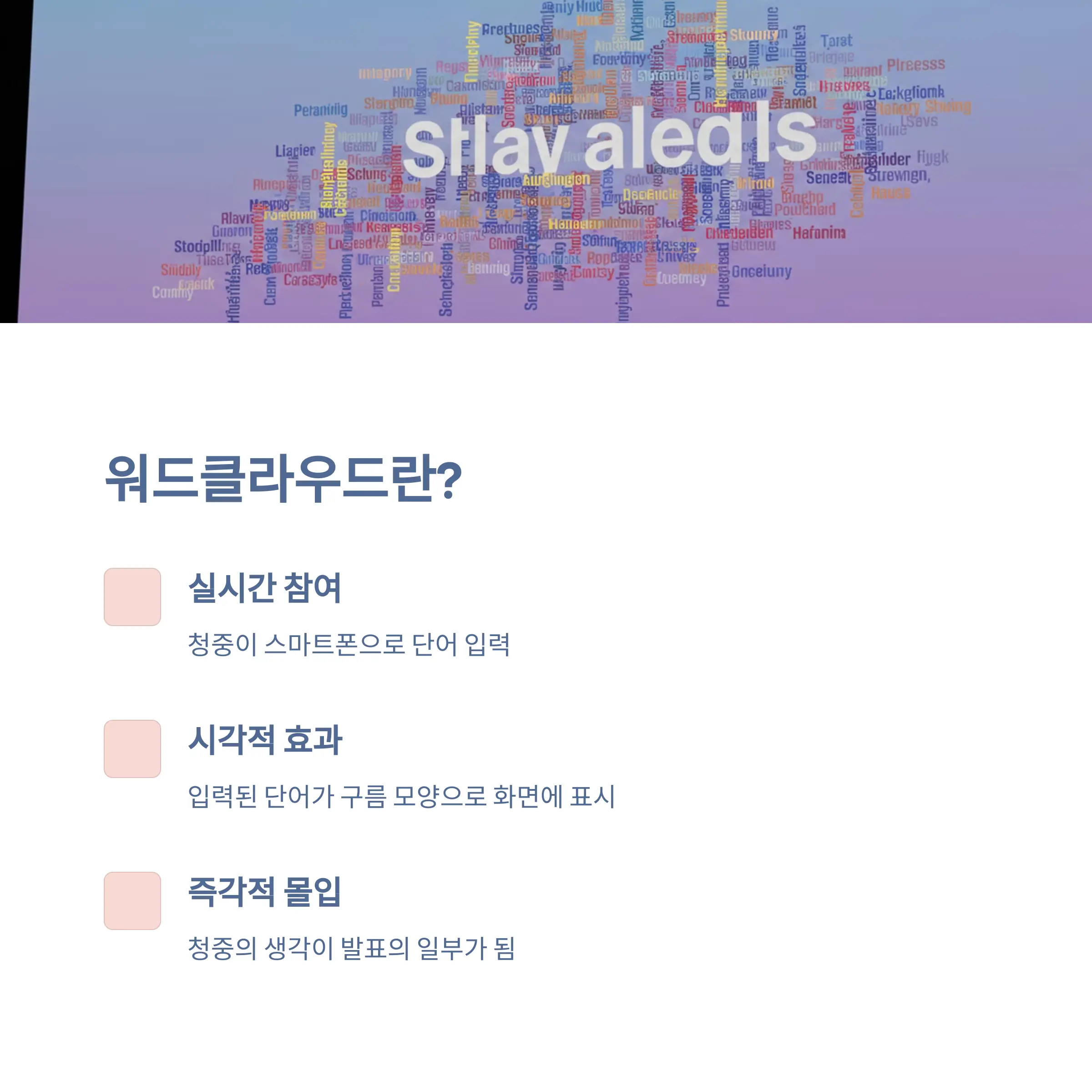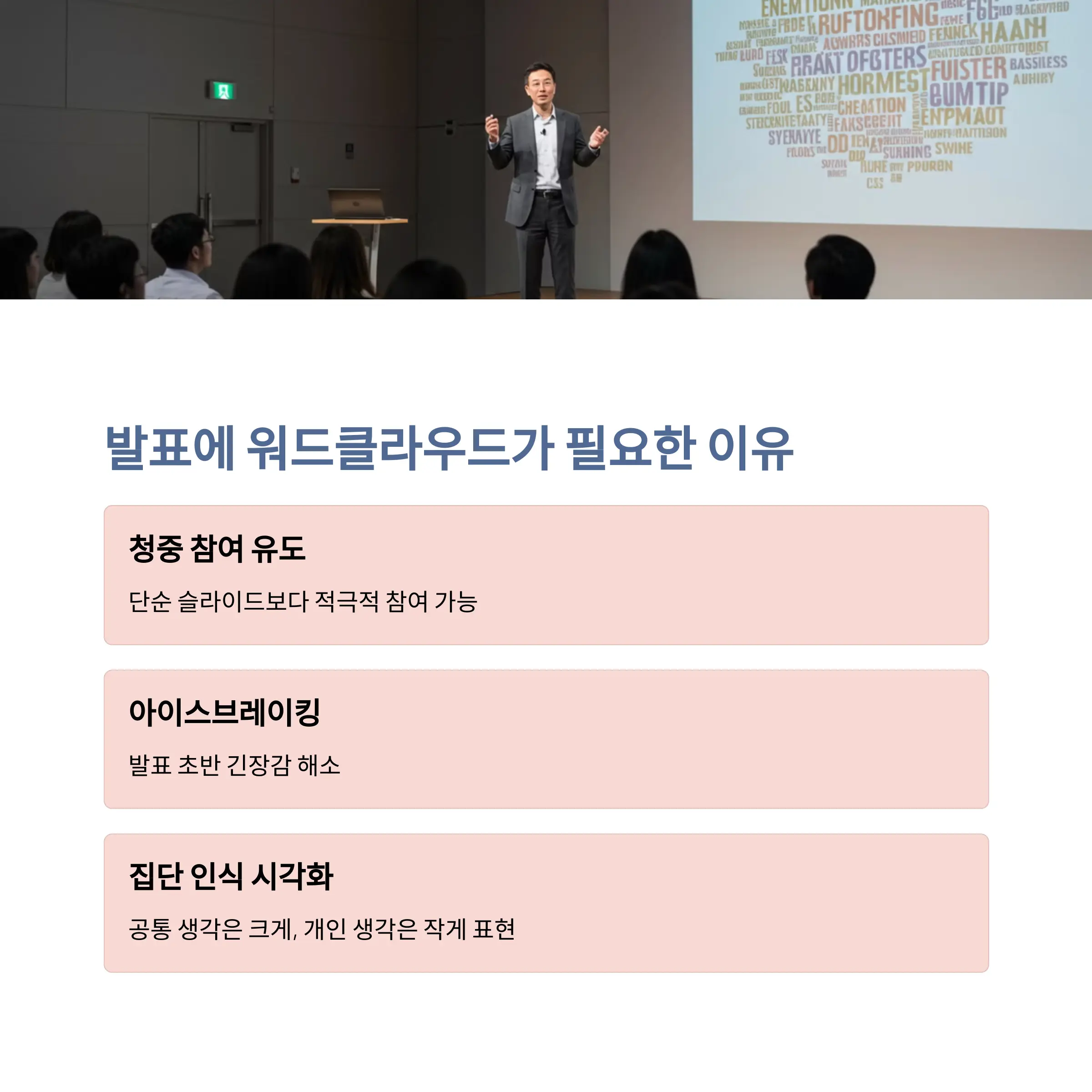 단순히 기술적으로 워드클라우드를 구현하는 것만으로는 부족합니다. 어떻게 활용하느냐에 따라 발표의 분위기와 몰입도가 달라지기 때문입니다.
