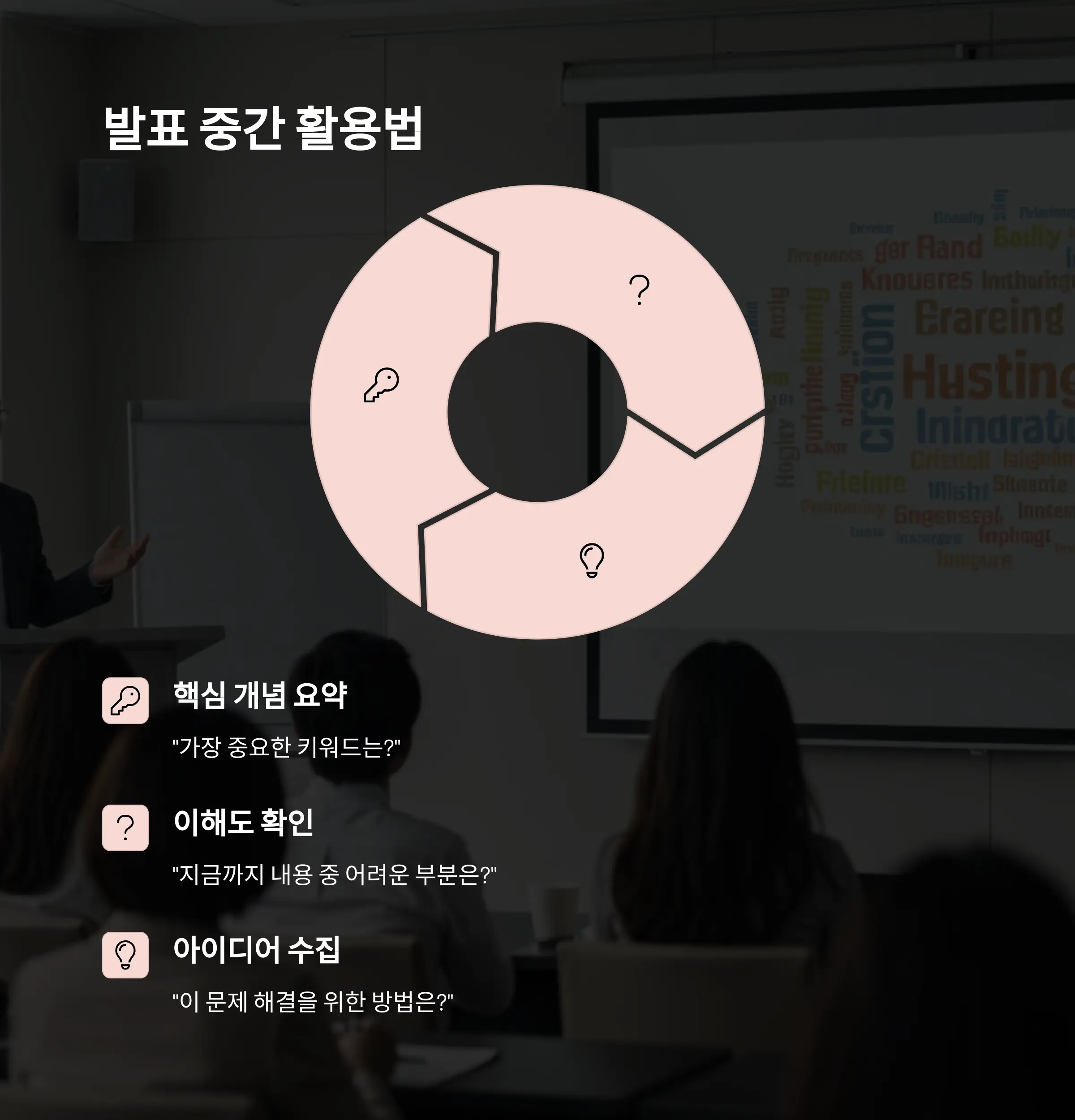 발표 중간에는 “이 주제에서 가장 중요한 키워드는 무엇인가요?” 같은 질문을 활용하면, 청중이 내용을 정리하며 참여하게 됩니다. 그 과정에서 발표자는 청중이 어떤 부분에 집중하고 있는지를 실시간으로 확인할 수 있어요.