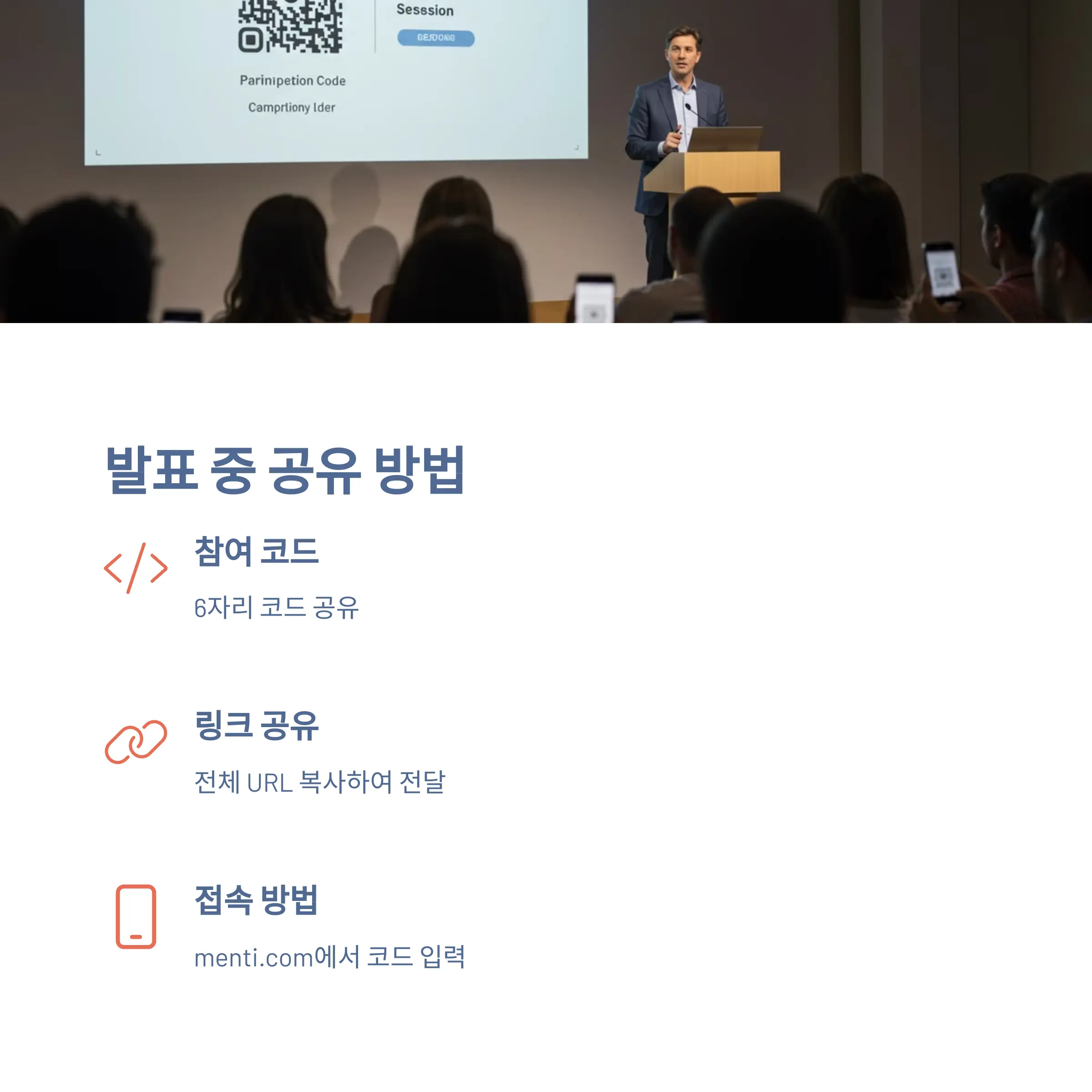 청중은 menti.com에 접속한 뒤 코드를 입력하면 바로 참여할 수 있어요.