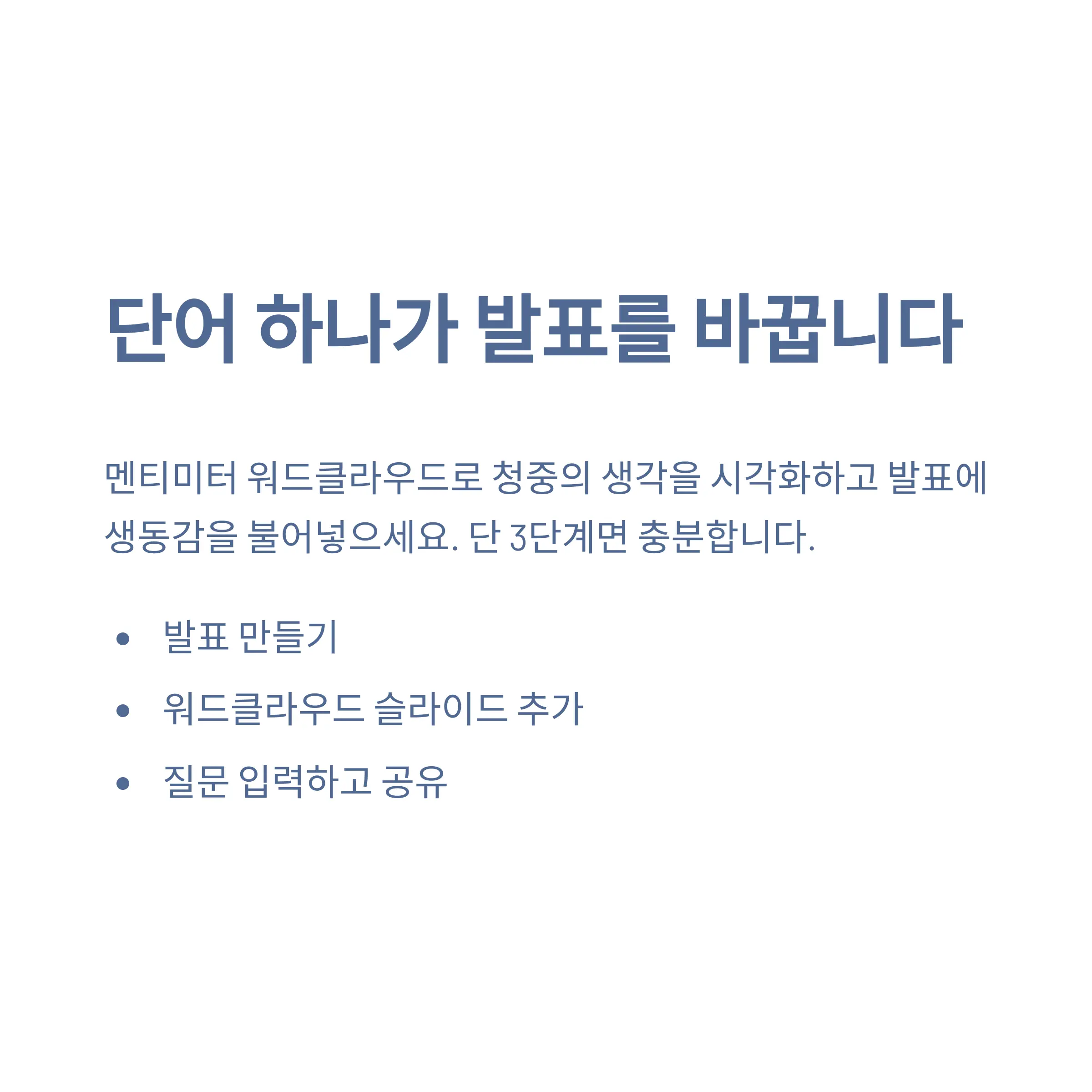많은 발표자들이 “청중 반응을 어떻게 끌어낼 수 있을까?”를 고민합니다. 그럴 땐 이 워드클라우드 하나로 충분히 시작할 수 있어요. 글자 하나하나가 사람들의 생각이 되고, 그 생각들이 화면 위에 커다란 흐름을 만들어요.