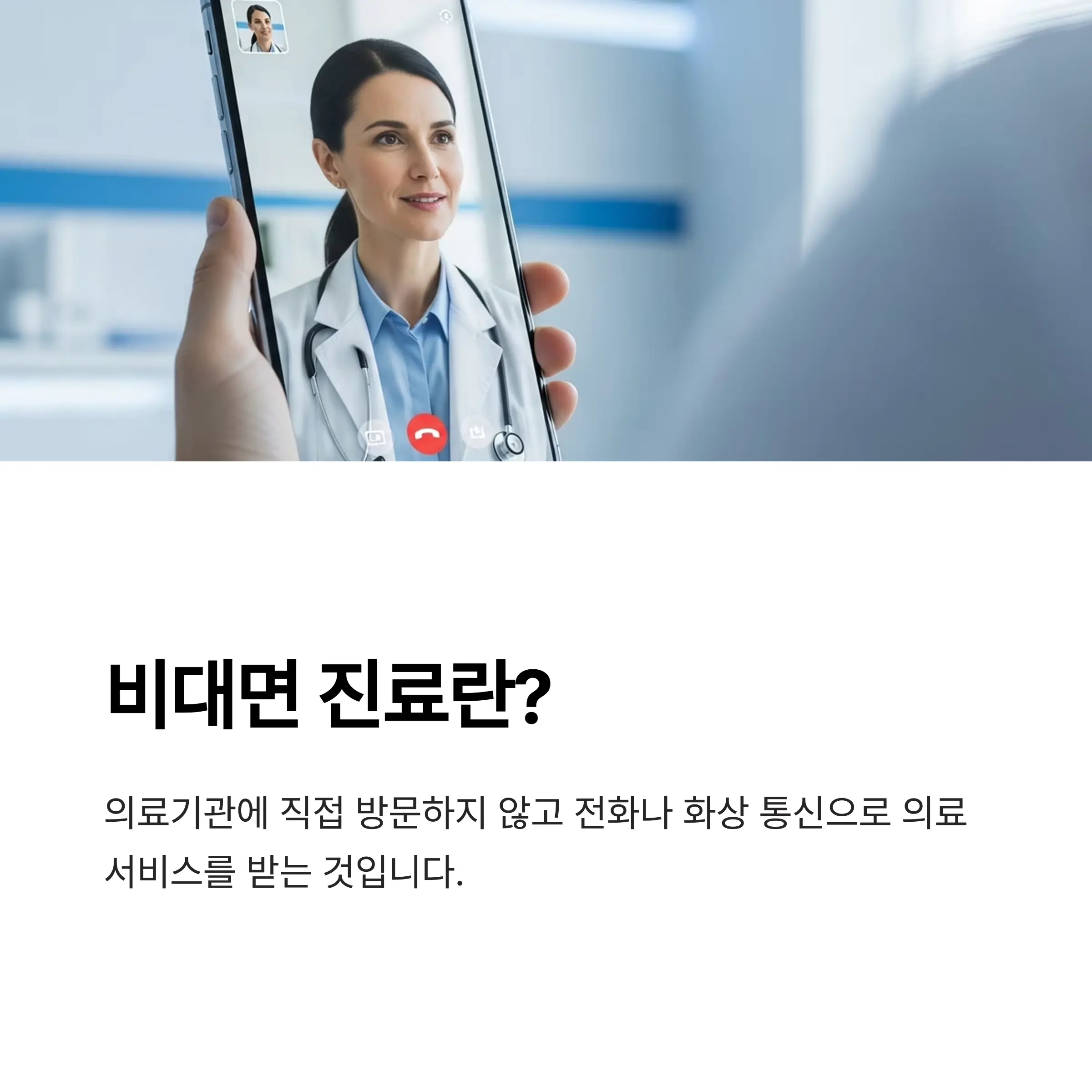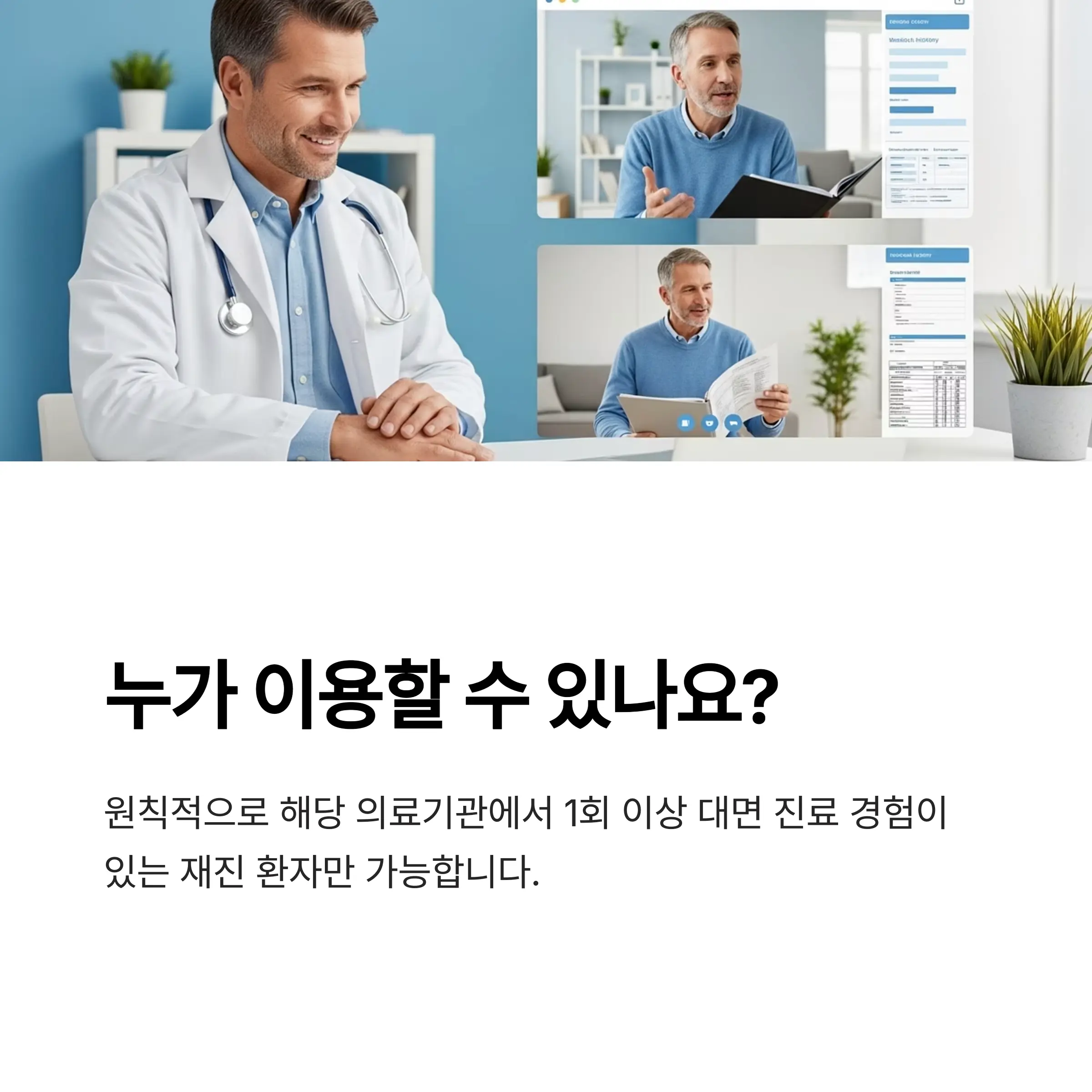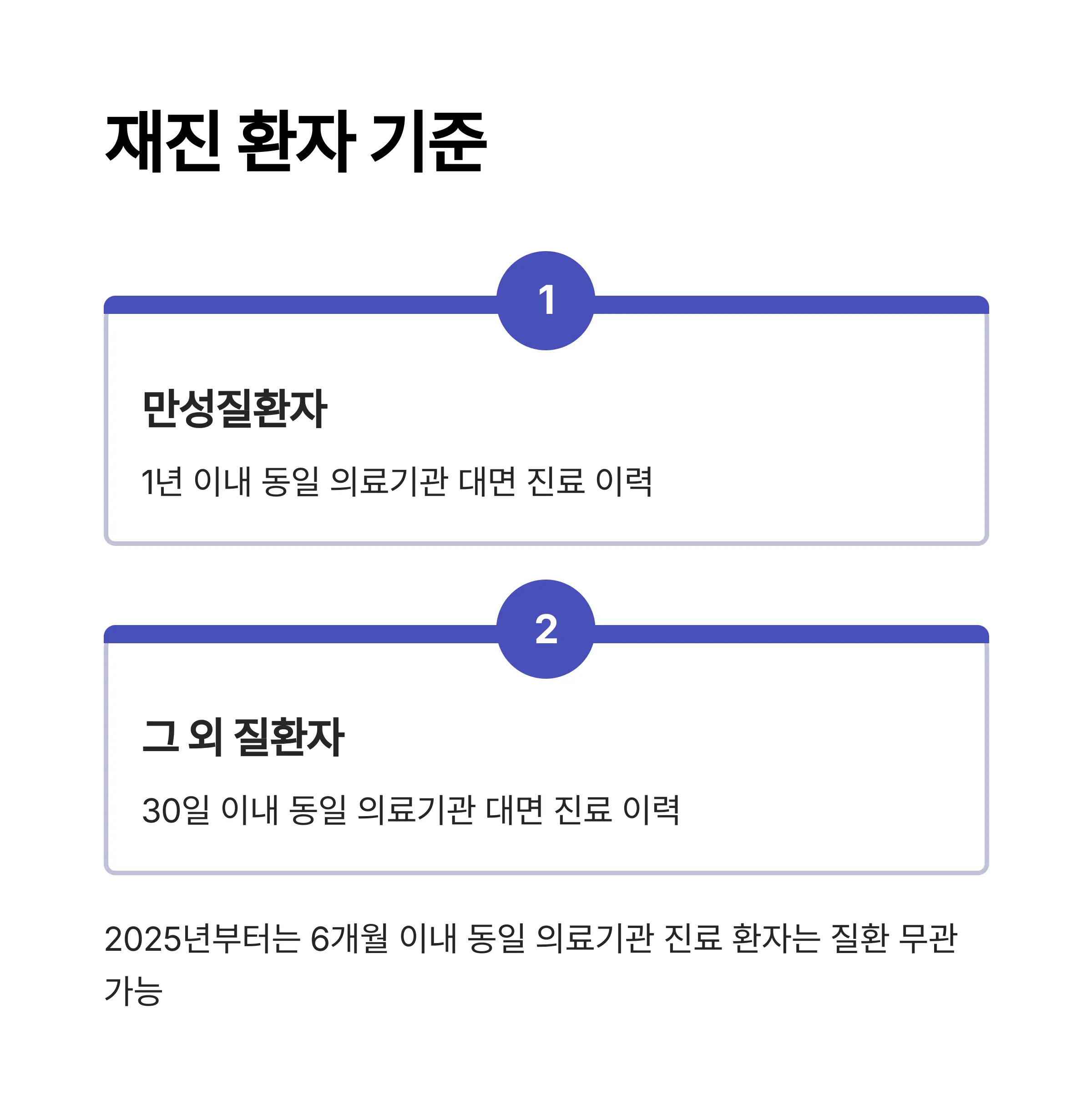 - 적용 기준: 만성질환자(고혈압, 당뇨 등)는 1년 이내, 그 외 질환자는 30일 이내에 동일한 의료기관에서 대면 진료를 받은 이력이 있어야 합니다. (2025년 최신 지침에 따라 6개월 이내 동일 의료기관에서 진료받았던 환자라면 질환 종류 무관하게 의사 판단 하에 비대면 진료 가능)