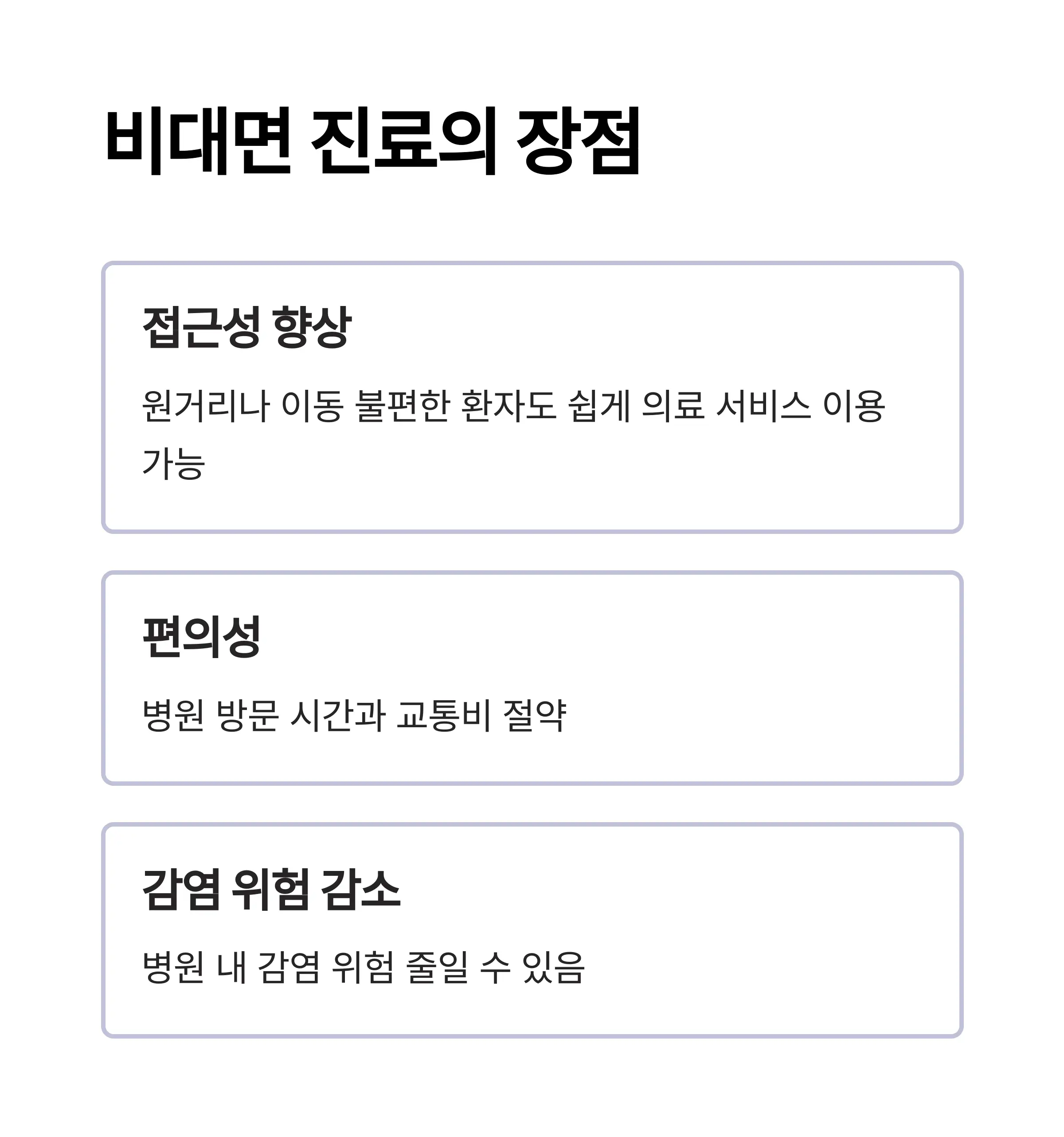 - 편의성: 병원 방문에 드는 시간(이동, 대기)과 비용(교통비)을 절약할 수 있습니다.