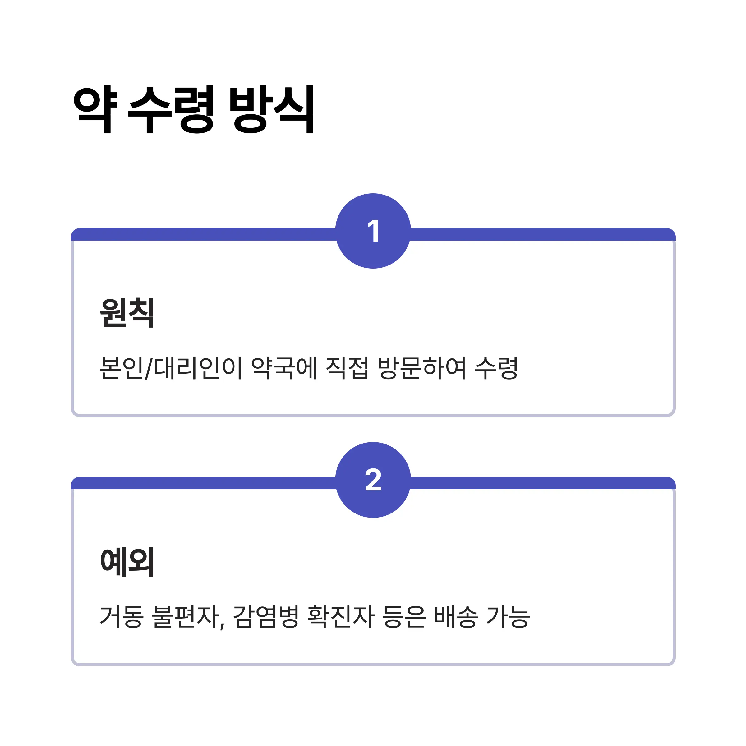 - 재택 수령 (예외): 다음과 같은 경우에 한해 예외적으로 약 배송(재택 수령)이 허용됩니다.