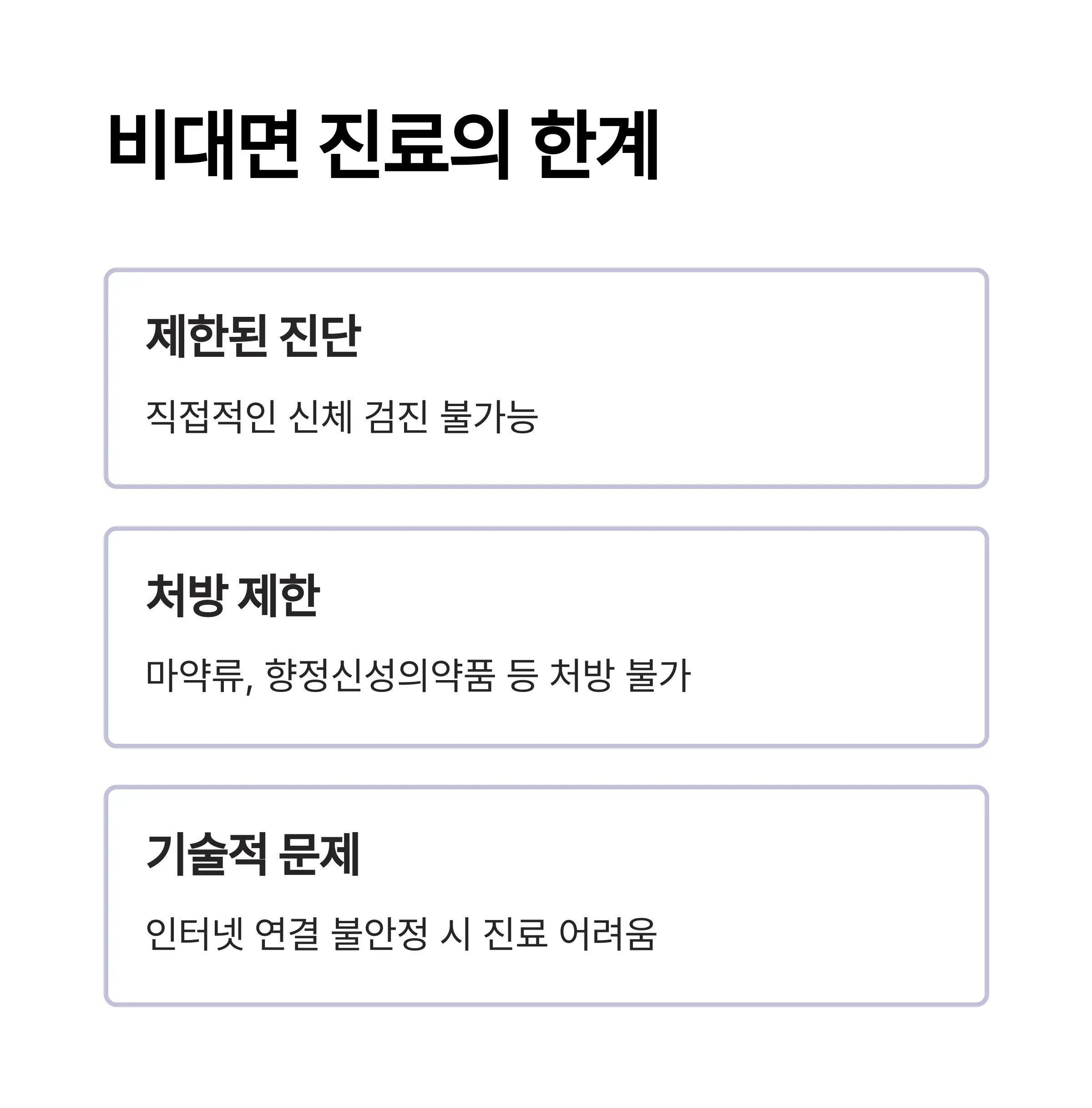 - 의사소통의 한계: 화면이나 전화만으로는 대면 진료만큼 상세한 신체 검진이나 비언어적 소통이 어려울 수 있습니다.