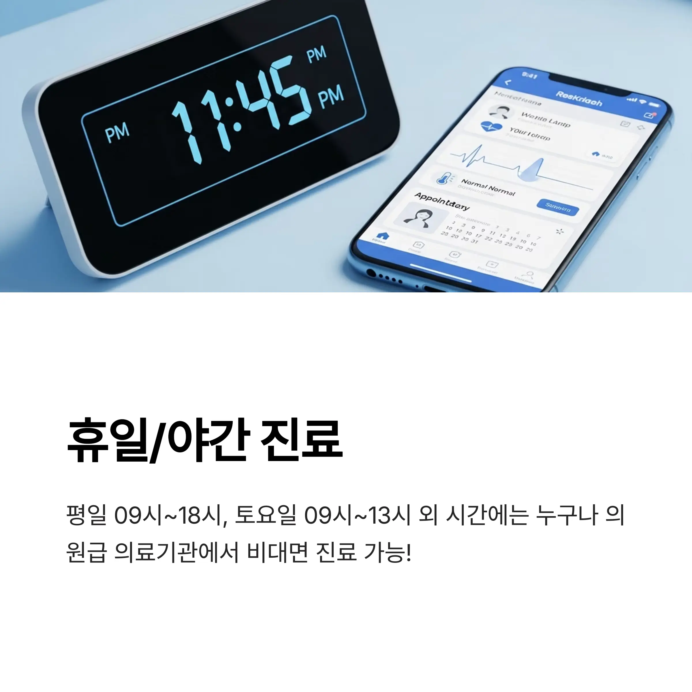- 의료 공백 해소: 야간, 휴일 등 진료가 어려운 시간에도 의료 서비스를 이용할 수 있습니다.