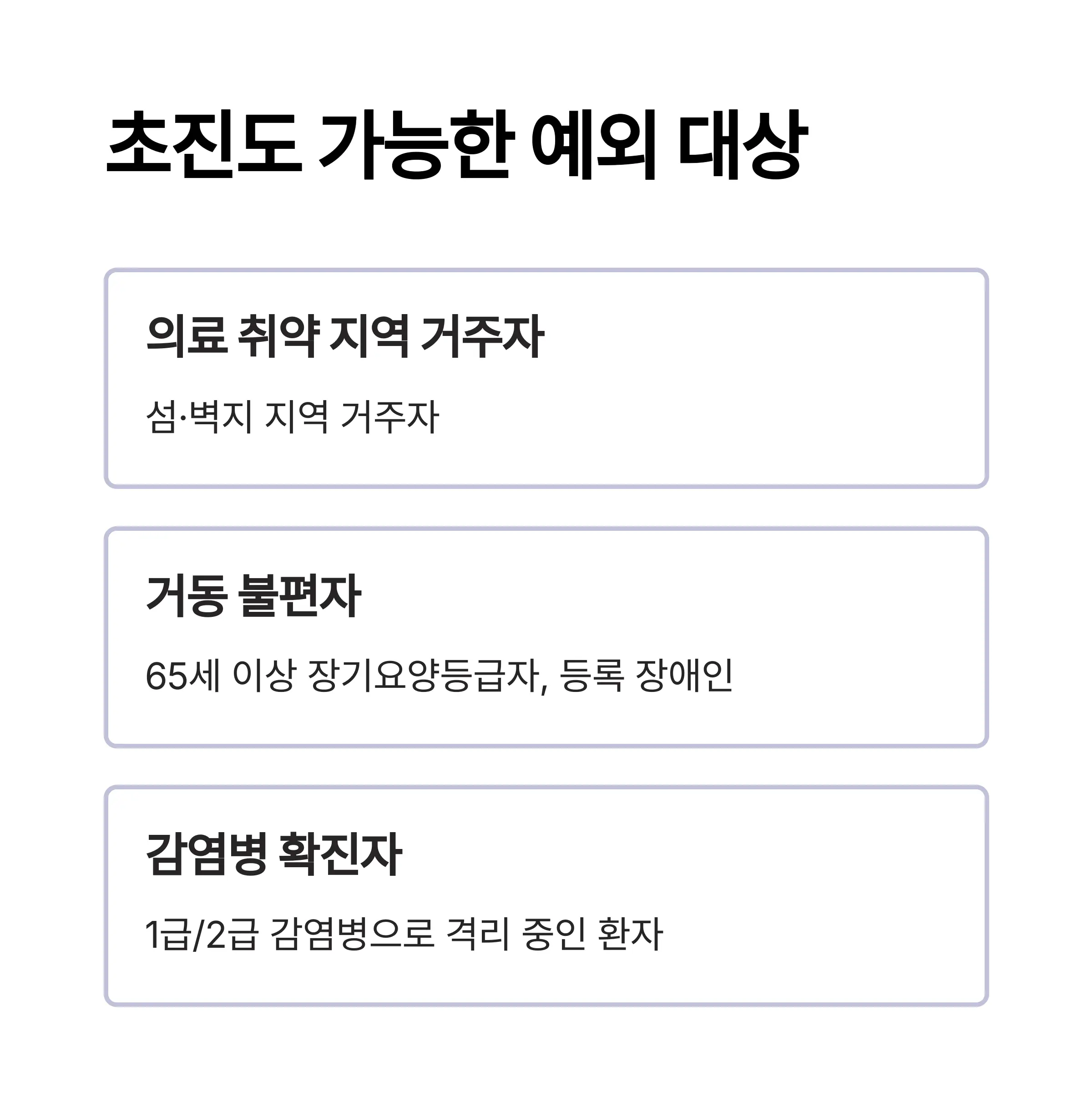 - 의료 취약 지역 거주자: 섬·벽지 지역 또는 보건복지부 장관이 정하는 의료취약지(전국 96개 시·군·구) 거주자.