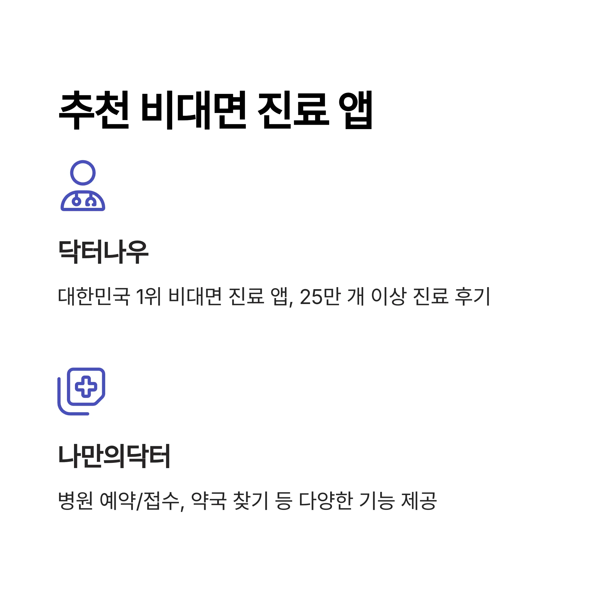 - 나만의닥터: 또 다른 인기 비대면 진료 앱으로, 병원 예약/접수, 약국 찾기 등 다양한 기능을 제공합니다.