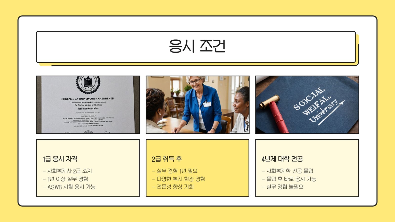 사회복지사 1급 시험에 응시하려면 사회복지사 2급을 취득한 후 1년 이상의 실무 경험이 필요합니다. 또는 4년제 대학에서 사회복지학을 전공하고 졸업하면 바로 응시할 수 있습니다.