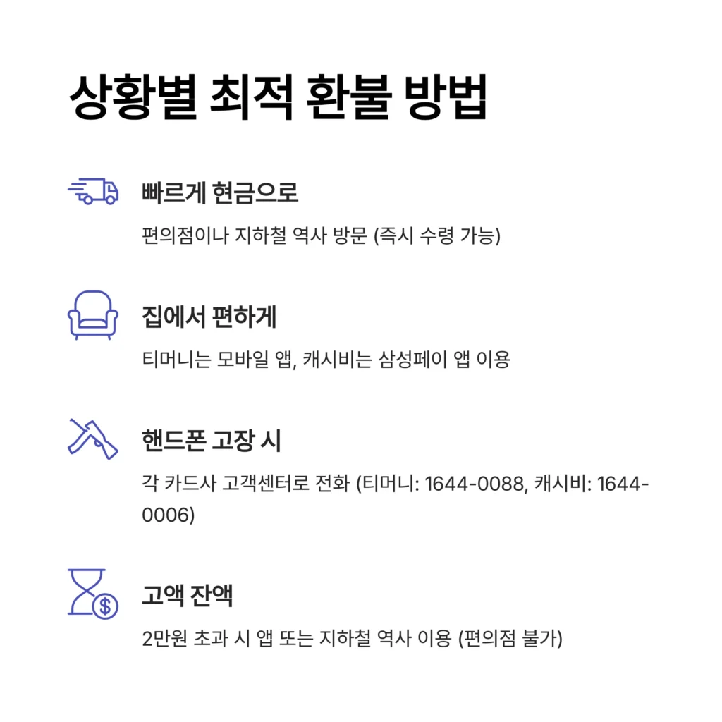 앱 설치가 번거롭다면 가까운 지하철 역사나 편의점에서 현금으로 환불 받을 수 있습니다.
