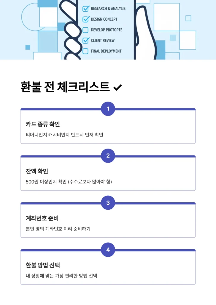 *참고: 위 수수료 및 한도는 정책에 따라 변동될 수 있습니다. 가장 정확한 최신 정보는 각 사의 앱이나 고객센터를 통해 직접 확인하는 것이 좋습니다. 잔액이 수수료(500원)보다 적게 남은 경우 아쉽지만 환불은 어렵습니다.