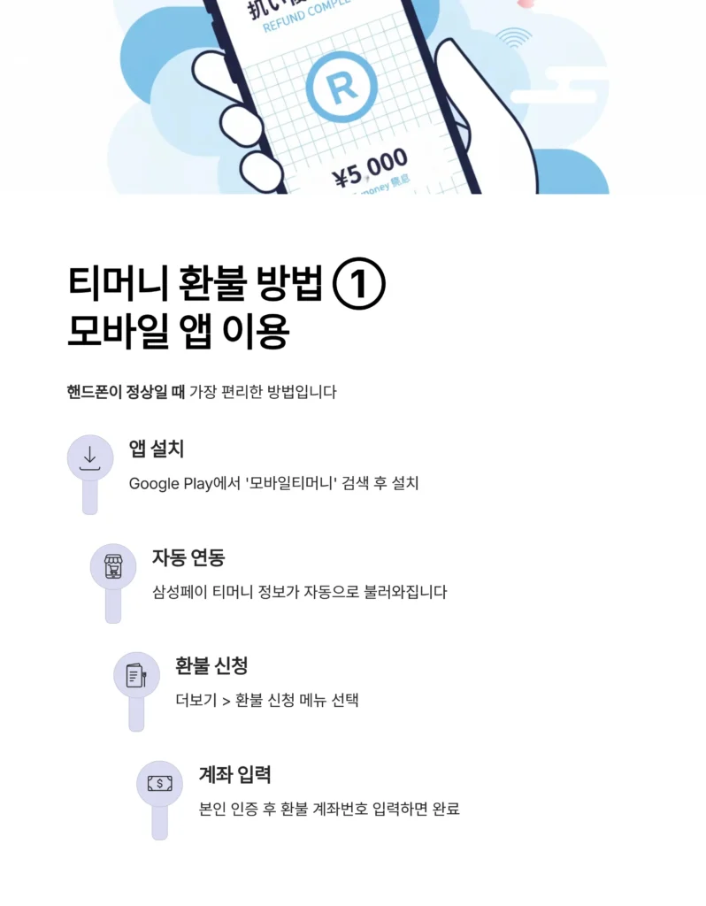 티머니 로고를 확인하셨다면 이부분을 참고하시면 됩니다. 티머니는 삼성페이 앱에서 직접 환불이 불가능하며 별도의 앱을 설치하거나 오프라인 창구를 이용해야 하는 약간의 번거로움이 있습니다.