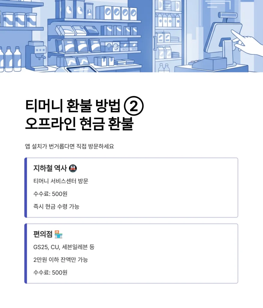 - 지하철: 역사 내 티머니 서비스센터 방문 (수수료 500원)