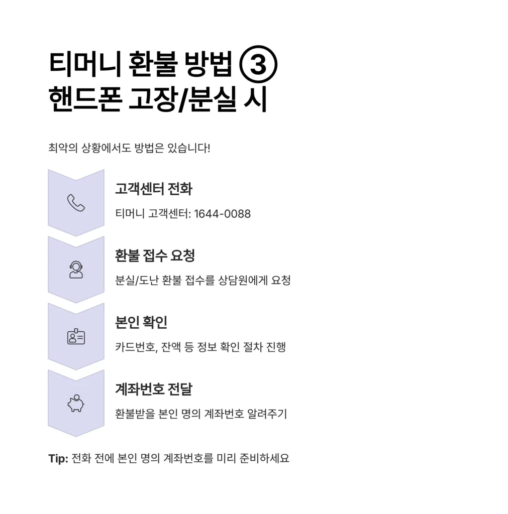액정이 깨져서 폰을 켤 수 없을 경우 등 이런 최악의 상황에서도 방법은 있습니다. 이럴 때는 티머니 고객센터가 유일한 해결책이죠.