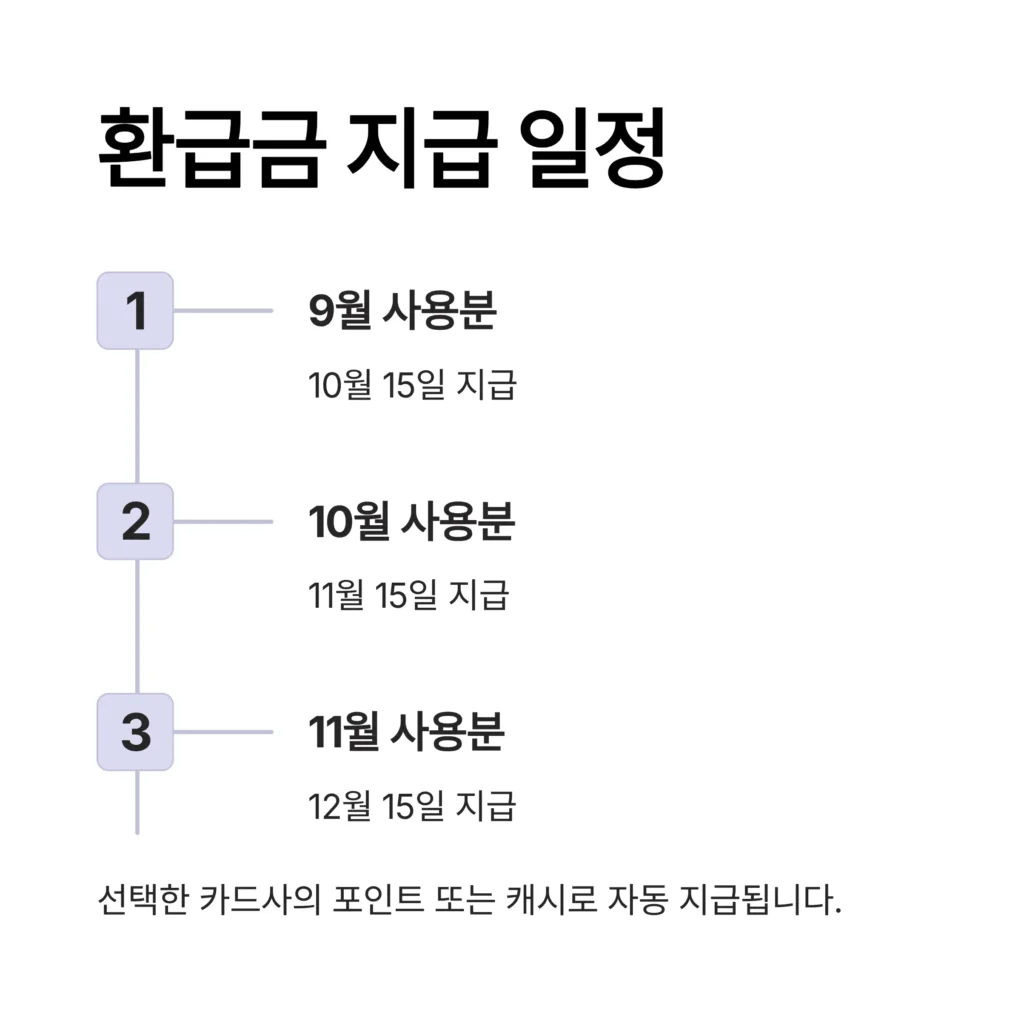 A: 9월 사용분은 10월 15일, 10월 사용분은 11월 15일, 11월 사용분은 12월 15일에 신청 시 선택했던 카드사의 포인트 또는 캐시로 자동 지급됩니다.