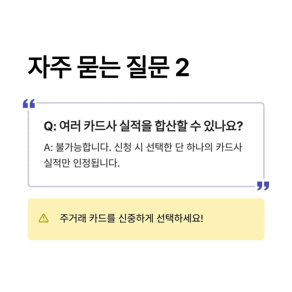 A: 아니요 불가능합니다. 신청 시 선택한 단 하나의 카드사에서 사용한 금액만 실적으로 인정됩니다. 따라서 2분기에 가장 많이 사용했던 주거래 카드를 선택하는 것이 유리합니다.