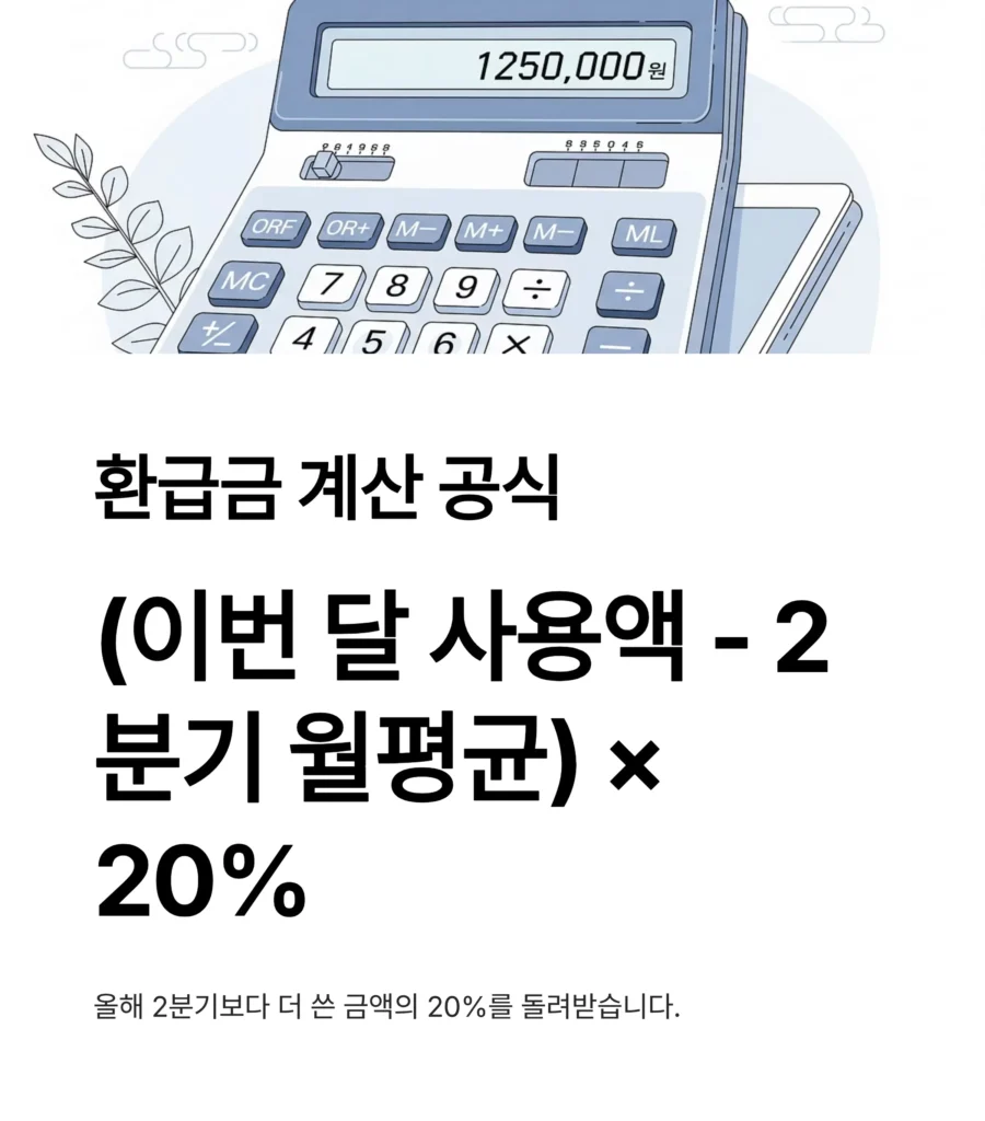 환급금은 올해 2분기 (4월~6월)에 사용한 월평균 카드값보다 이번달에 더 많이 쓴 금액의 20%를 돌려주는 방식입니다.