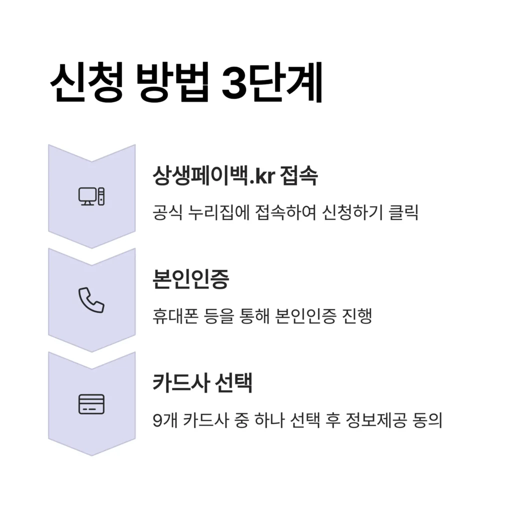 신청하지 않으면 아무리 카드를 많이 써도 혜택을 받을 수 없으니 신청 기간이 끝나기 전에 지금 바로 상생페이백.kr에 접속해서 신청부터 완료하시길 바랍니다.