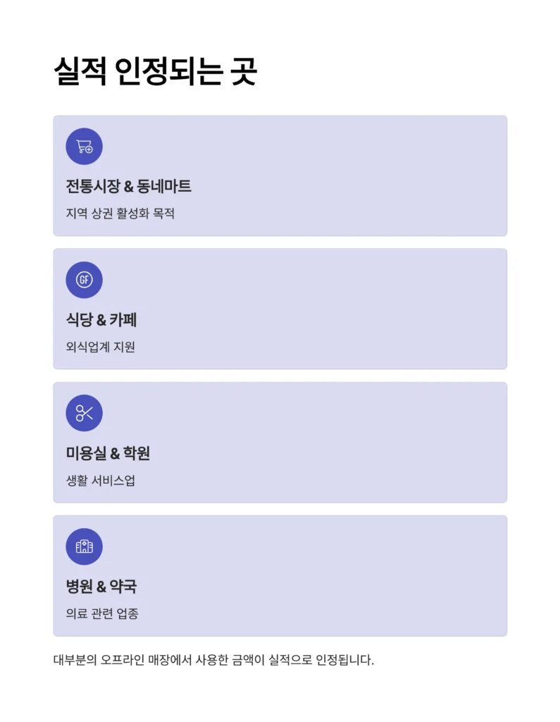 전통시장, 동네마트, 식당, 카페, 미용실, 학원, 병원, 약국, 주유소 등 대부분의 오프라인 매장에서 사용한 금액이 실적으로 인정됩니다.