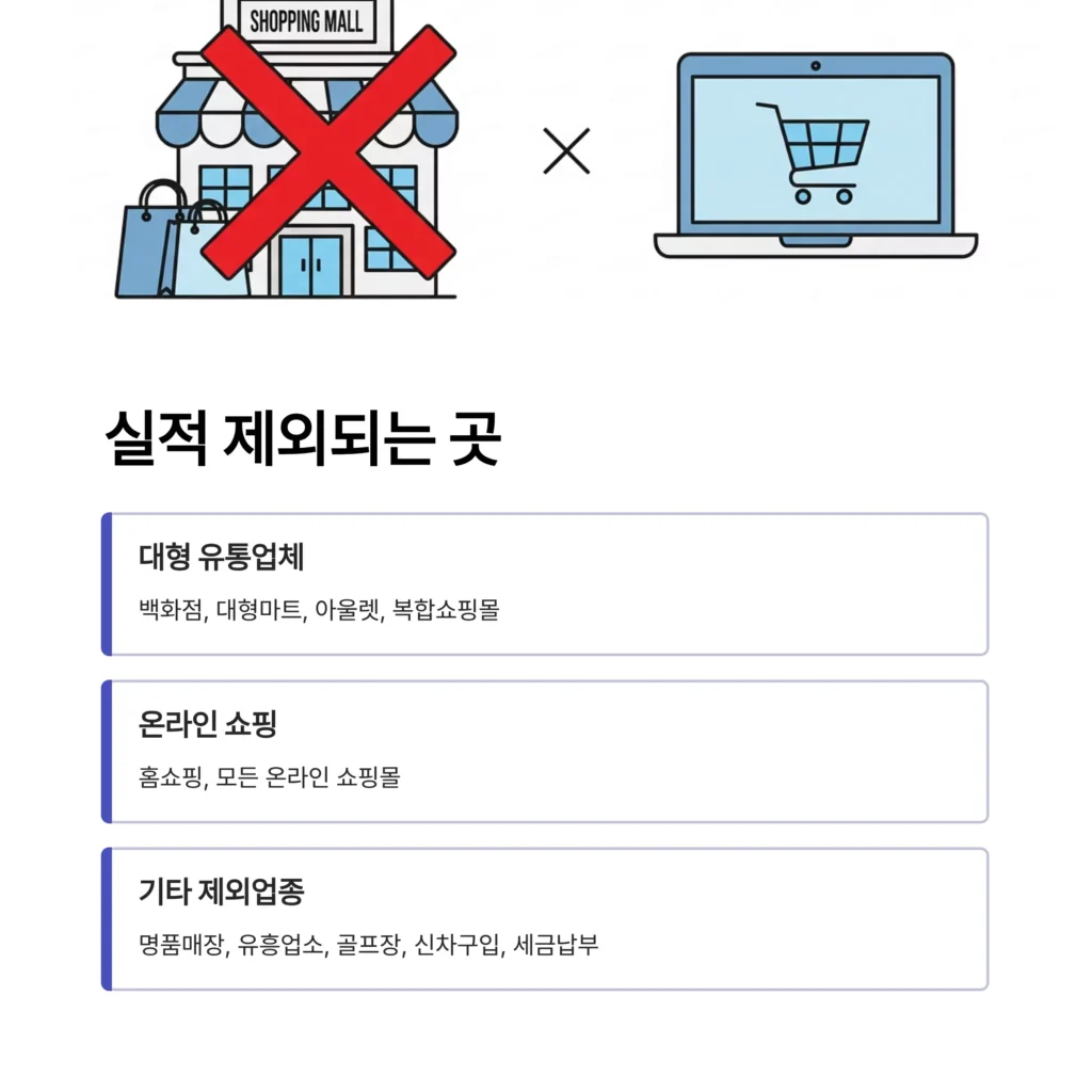 • 기타: 명품 전문매장, 유흥업소, 실외 골프장, 신차 구입, 세금 및 공과금 납부 등