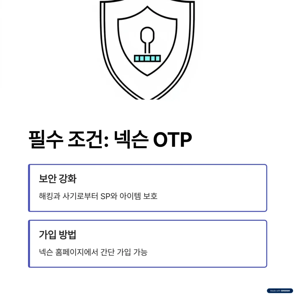 플리마켓을 이용하기 위해서는 넥슨 OTP 가입이 필수입니다. 이는 해킹이나 사기로부터 유저들의 소중한 SP와 아이템을 보호하기 위한 이중 보안 장치입니다. 아직 넥스OTP에 가입하지 않았다면 넥슨 홈페이지에서 간단하게 가입할 수 있습니다.