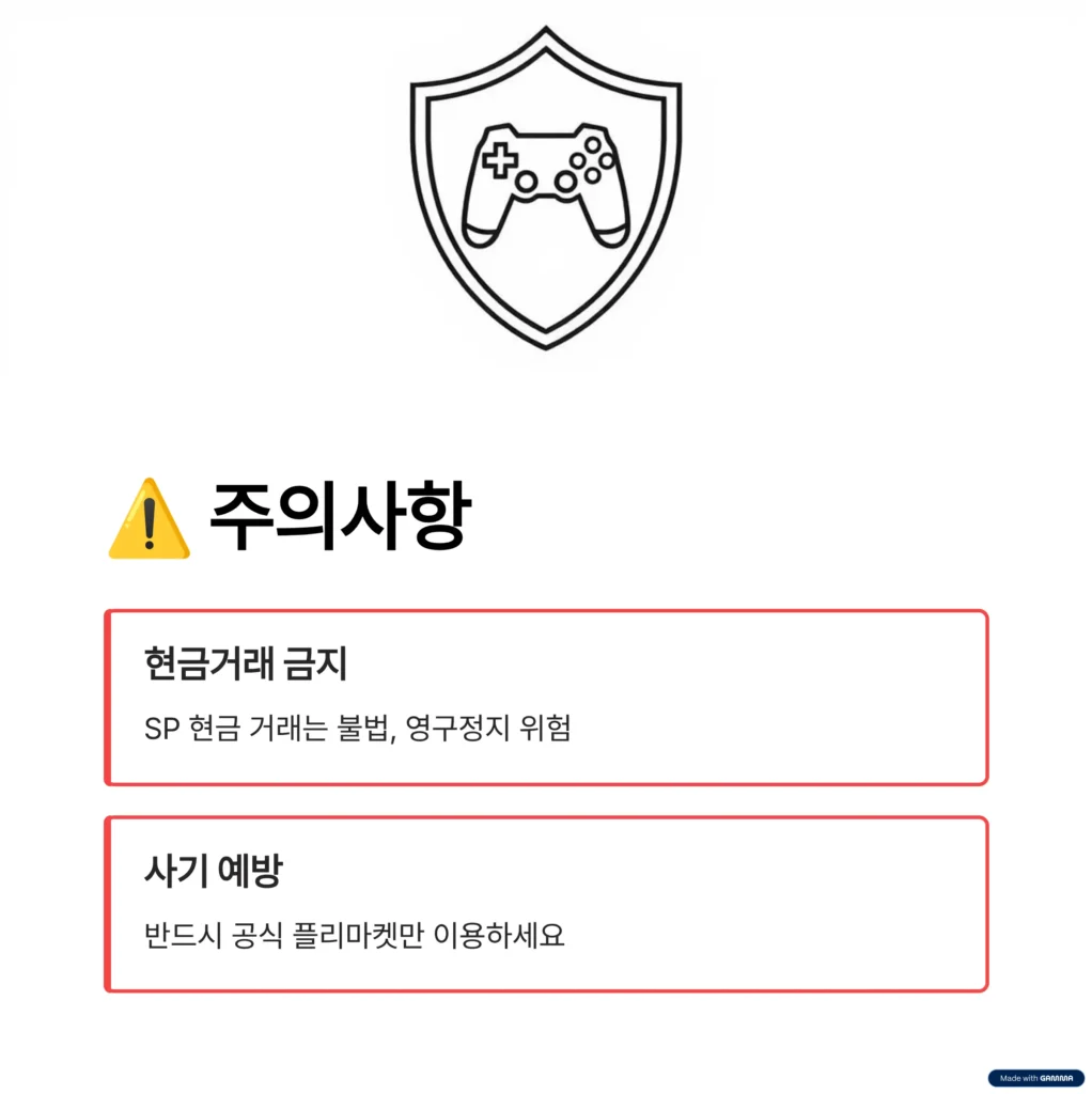 SP를 현금이나 현물로 거래하는 것은 ‘게임산업진흥에 관한 법률 위반’에 해당합니다. 이는 게임사 약관 위반으로 영구 이용 제한 등 강력한 제재를 받을 수 있으니 절대로 현금 거래를 시도하지 마세요.