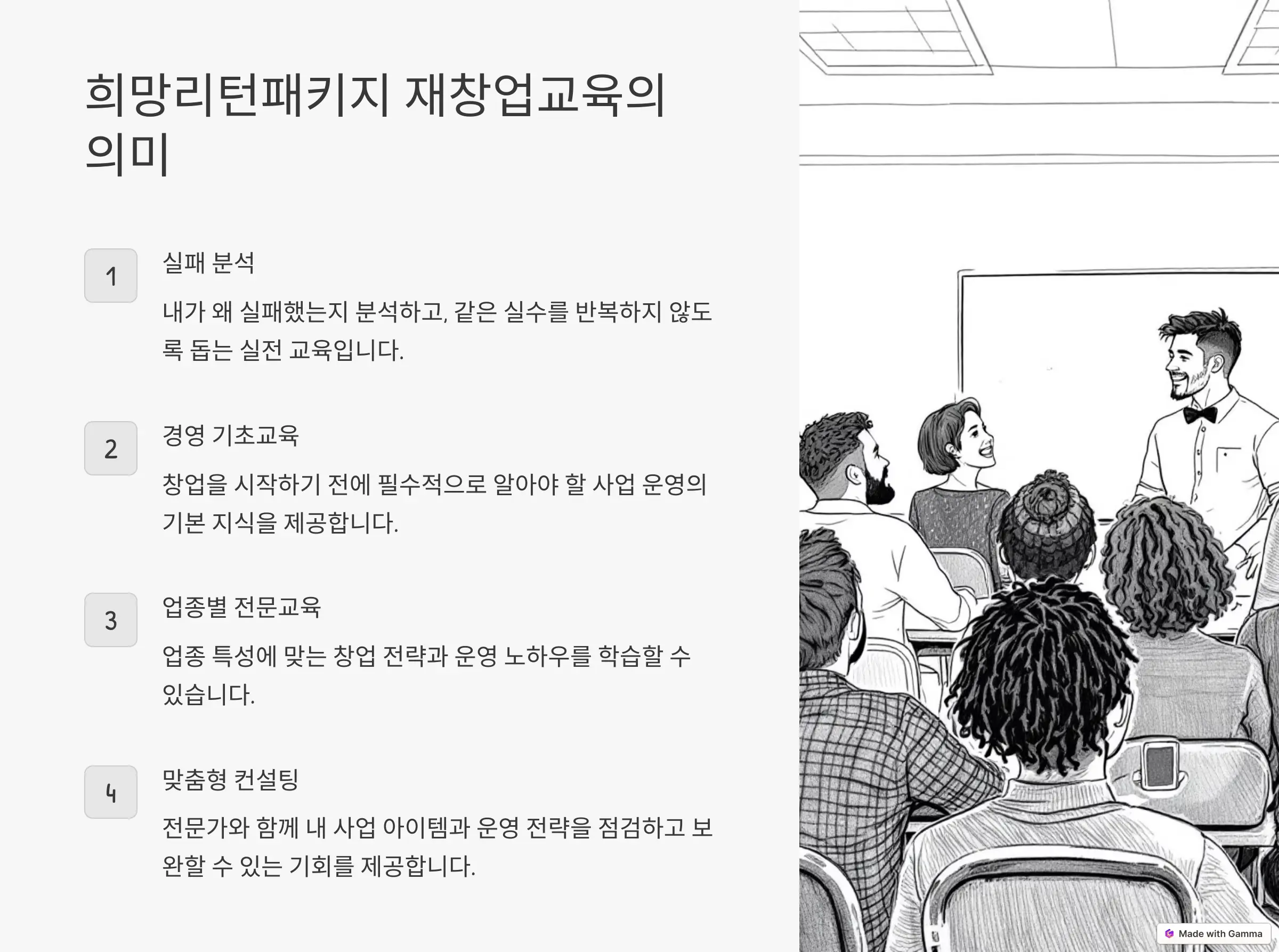 저 같은 경우, 기존 사업이 실패하고 재창업을 고민하던 중에 이 교육을 접하게 되었습니다. 처음에는 “내가 다시 창업할 수 있을까?” 하는 두려움이 있었지만, 교육을 듣고 나서 자신감을 얻을 수 있었습니다.