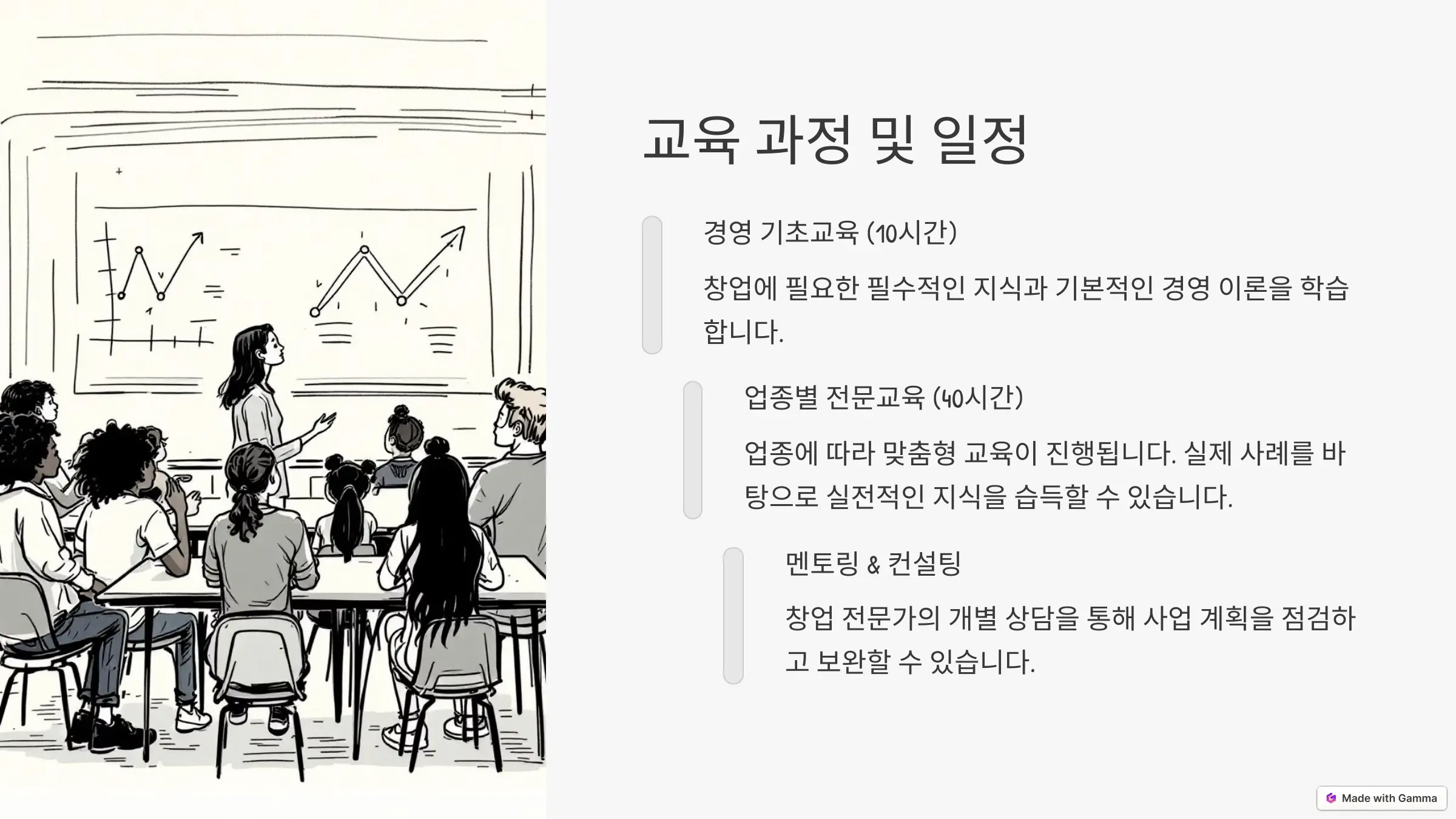 교육 과정이 체계적으로 구성되어 있어, 창업 경험이 없는 사람도 쉽게 따라갈 수 있습니다.