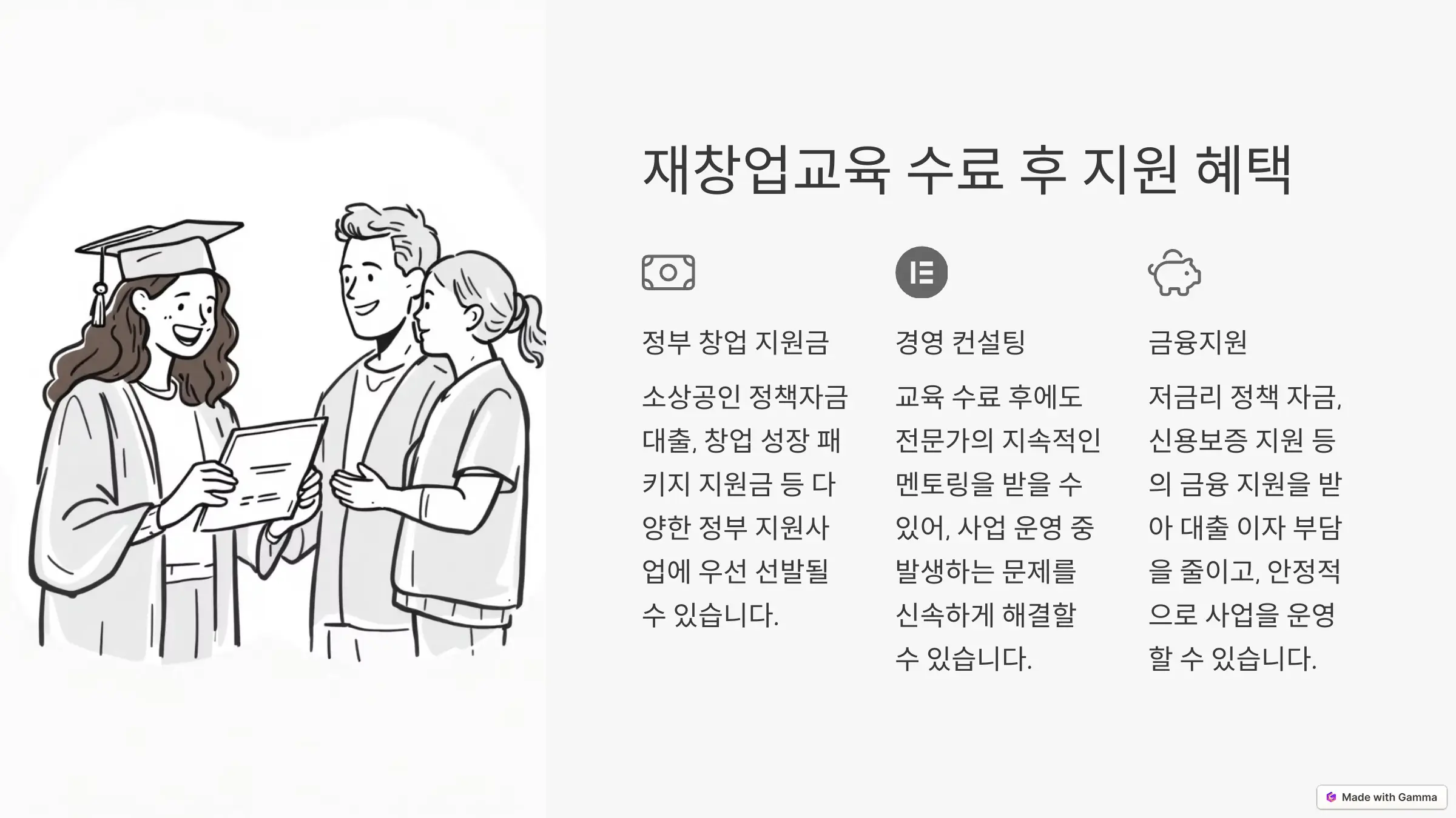 - 정부 지원사업 연계: 교육 수료 후 정부 창업 지원금, 정책자금 대출, 창업 컨설팅 등의 추가 지원 가능