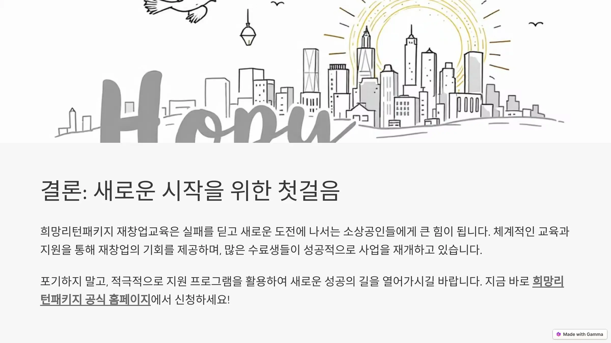 - 희망리턴패키지 공식 홈페이지(https://www.sbiz.or.kr)에서 신청 가능합니다.