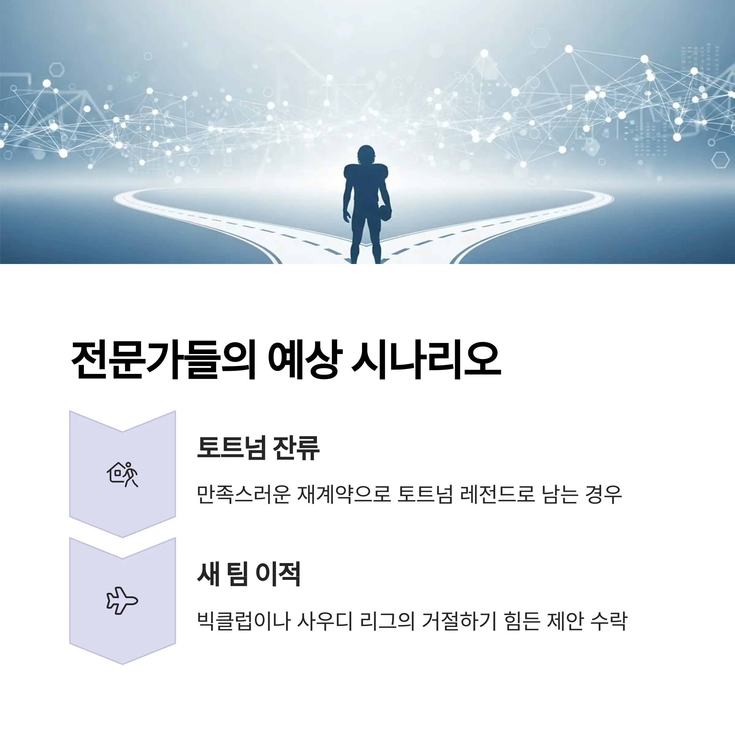 두 번째는 이적 시나리오입니다. 만약 레알 마드리드 같은 빅클럽이나 사우디 리그 팀에서 거절하기 힘든 엄청난 제안이 들어온다면, 손흥민 선수도 새로운 도전을 고민할 수 있을 것입니다.